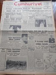 Cumhuriyet Gazetesi - 14 Ağustos 1954 - Avrupa Ordusunun Akıbeti Belli Oluyor - Demokrat Partideki Tasfiye Hareketi Devam Ediyor - Cumhurreisi Celal Bayar Ayın 28'inde Yugoslavya'ya Gidiyor - Amerikan Senatosunun Kızıllara Dair Kararı - Galata Köprüsünün Tamiri Tamamlandı - Japon İmparatoru Hirohito'ya Suikast Teşebbüsü - Portekizle Hindistan Arasındaki Gerginlik - Güreşçi Celal Atiğin Kahvesinde Bir Adam Öldürüldü - Film Yıldızı Neriman Köksal Puro Tuvalet Sabunları Kullanıyorum Diyor - Yunus Nadi Mükâfatı - İstanbul Enternasyonal Tenis Turnuvası - İstanbul'un Kok Kömür İhtiyacı Temin Edildi - Napoleon'un Piç Olduğu İddiası Fransa'da Hararetli Tartışmalara Yol Açıyor - Resimli Romanımız Ecel Gemisi - Hollywood'un En Güzel Kızı Dolores Dorn - Çifte Kuvvetli Yeni Mobilgas - Hamiyet Yüceses - İsmail Dümbüllü - Sabite Tur Gülerman - At Yarışları - Krem Pertev - Altın Evler - Sadeddin Kaynak Jubilesinde Saime Sinan'ı Da Dinleyeceksiniz - Lion Mağazası adlı eser, Kitap > Süreli Yayınlar > Gazeteler > Türkiye > Genel > Günlük kategorisinde İkinci El olarak satıştadır.