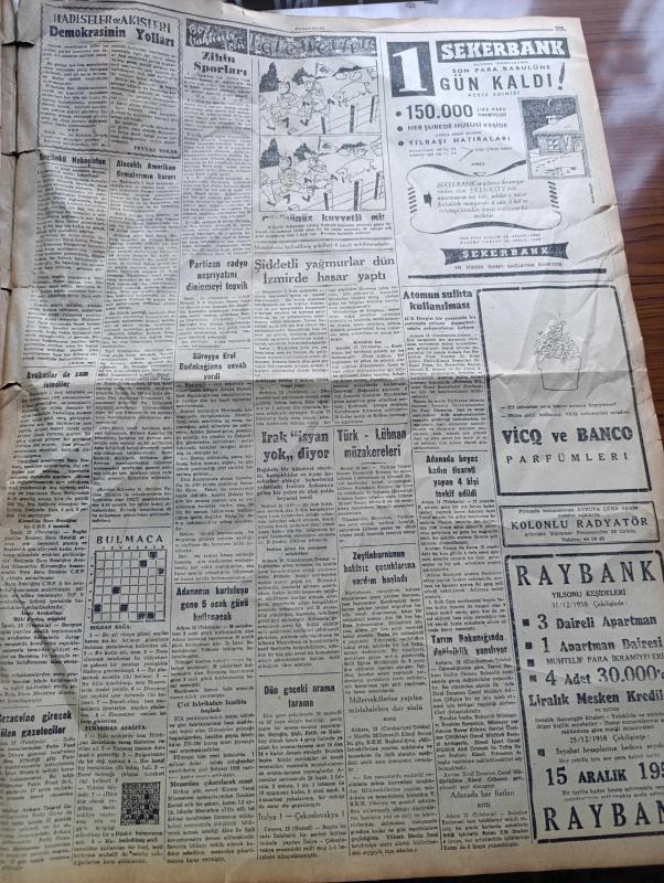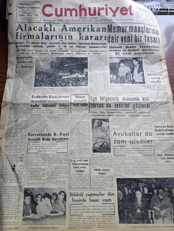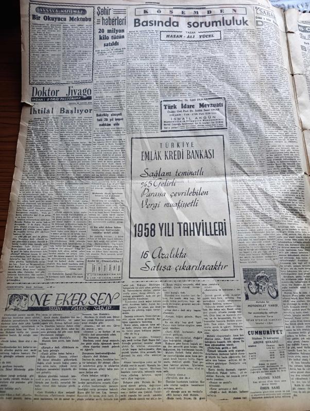 Cumhuriyet Gazetesi - 14 Aralık 1958 - Kardeşlik Zihniyeti Ve Haklar Yazan Nadir Nadi Köşe Yazısı - Alacaklı Amerikan Firmalarının Kararı - Mebus'un Bavulunda Kaçak Saatler - Üniversitede Demokrat Parti Gençlik Kolu Kuruluyor - Celal Bayar Adnan Menderes Ve Fatin Rüştü Zorlu Ankara'ya Gittiler - Doktor Jivago Yazan Boris Pasternak Yazı Dizisi Esin - Ne Ekersen Yazan Ömer Sakıp Yazı Dizisi - Basında Sorumluluk Yazan Hasan Ali Yücel Köşe Yazısı - Fezaya Dün Bir Maymun Fırlatıldı - Taşlıtarlada Bugün Muhtar Seçimleri Var - Haftanın Şakaları Yazan Burhan Felek - Habeşistanda En Çok Önem Verilen İş Yeni Mektepler Açmak - Partizan Radyo Neşriyatını Dinlemeyi Teşvik - Fenerbahçe'nin Karagümrüğü Dün 2 1 Mağlup Etti - Basketbolda Fenerbahçe Beşiktaş'ı Kadıköyspor Moda Rakiplerini Yendiler - Bugünkü Voleybol Maçları - Balina Ökçe Ve Tabanları adlı eser, Kitap > Süreli Yayınlar > Gazeteler > Türkiye > Genel > Günlük kategorisinde İkinci El olarak satıştadır.