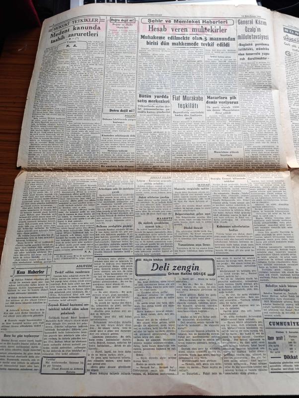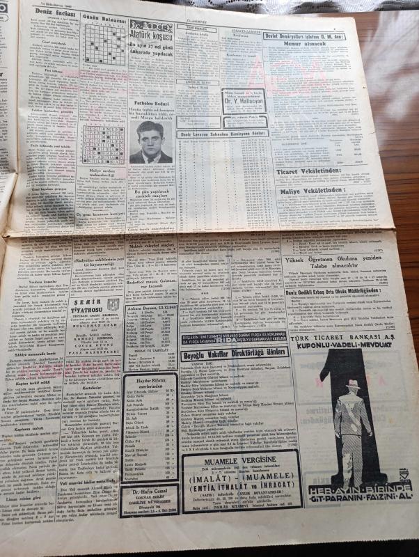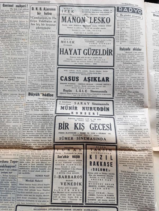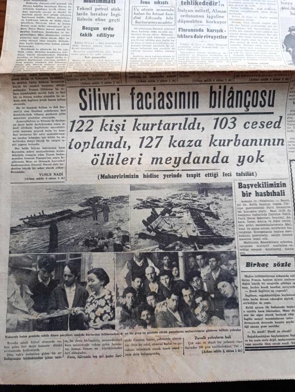 Cumhuriyet Gazetesi - 14 Birincikanun (Aralık) 1940 - Büyük Hadise Yazan Yunus Nadi Köşe Yazısı - Silivri Deniz Faciasının Bilançosu - 122 Kişi Kurtarıldı 103 Cesed Toplandı 127 Kaza Kurbanının Ölüleri Meydanda Yok Fotoğraf - Milli Şefimiz İsmet İnönü Dün Akşam Ankara Civarında Kısa Bir Seyahate Çıktılar - Yunan Ordusu Tepedelene Yaklaşıyor - Yugoslavya Macaristan Arasında Ebedi Dostluk Paktı Belgradda İmzalandı - İtalya'dan Akisler Duçenin Mevkii Tehlikededir - Zeynep Kamil Hastanesi Başhekimi Eyüp Aksoy'u Tehdid Eden Adam Yakalandı - Taksim Eminönü Arasında Otobüs Seferleri - General Kazım Özalp'ın Millete Tavsiyesi - Fransa'da Komünistlere Karşı Takibat - Napolyon'un Oğlunun Kemikleri Viyana'da ki Mezarından Çıkarıldı - Şark Osmanlıcasından Garb Osmanlıcasına Yazan İsmail Hami Danişmend - Hayat Güzeldir Filmi Bugün Melek Sinemasında - Manon Lesko Bugün İpek Sinemasında - Merhametten Maraz Yazan Stefan Zweig Yazı Dizisi - Saray Sinemasında Münir Nurettin Konseri - Atatürk Koşusu, Yunus Nadi tarafından kaleme alınmıştır. Cumhuriyet Gazetesi - 14 Birincikanun (Aralık) 1940 - Büyük Hadise Yazan Yunus Nadi Köşe Yazısı - Silivri Deniz Faciasının Bilançosu - 122 Kişi Kurtarıldı 103 Cesed Toplandı 127 Kaza Kurbanının Ölüleri Meydanda Yok Fotoğraf - Milli Şefimiz İsmet İnönü Dün Akşam Ankara Civarında Kısa Bir Seyahate Çıktılar - Yunan Ordusu Tepedelene Yaklaşıyor - Yugoslavya Macaristan Arasında Ebedi Dostluk Paktı Belgradda İmzalandı - İtalya'dan Akisler Duçenin Mevkii Tehlikededir - Zeynep Kamil Hastanesi Başhekimi Eyüp Aksoy'u Tehdid Eden Adam Yakalandı - Taksim Eminönü Arasında Otobüs Seferleri - General Kazım Özalp'ın Millete Tavsiyesi - Fransa'da Komünistlere Karşı Takibat - Napolyon'un Oğlunun Kemikleri Viyana'da ki Mezarından Çıkarıldı - Şark Osmanlıcasından Garb Osmanlıcasına Yazan İsmail Hami Danişmend - Hayat Güzeldir Filmi Bugün Melek Sinemasında - Manon Lesko Bugün İpek Sinemasında - Merhametten Maraz Yazan Stefan Zweig Yazı Dizisi - Saray Sinemasında Münir Nurettin Konseri - Atatürk Koşusu adlı eser Türkçe dilindedir.