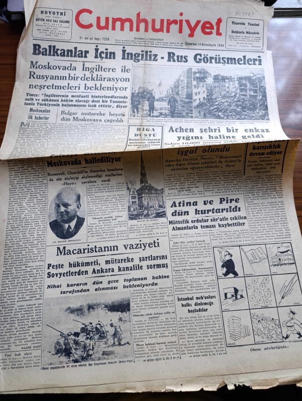 Cumhuriyet Gazetesi - 14 Birinciteşrin (Ekim) 1944 - Moskova'dan İlk Haberler Yaşam Nadir Nadi Köşe Yazısı - Balkanlar İçin İngiliz Rus Görüşmeleri - Achen Şehri Bir Enkaz Yığını Haline Geldi Fotoğraf - Riga Düştü - Atina ve Pire Dün Kurtarıldı - Macaristan'ın Vaziyeti Peşte Hükümeti Mütareke Şartlarını Sovyetlerden Ankara Kanalıyla Sormuş - İstanbul Mebusları Halkı Dinlemeye Başladılar - İspanya'da Karışıklık Devam Ediyor - Franco Hükümeti - Bu Dünyada Harpten Başka Ne Oluyor - Radyo Foto Nedir - Almanya'nın İkide Bir Harp Çıkarması Nasıl Önlenebilir - Mumyalar Kralı Ses Sinemasında - İsmail Dümbüllü Beyoğlu İstanbul Gazinosunda - Elazığ Tunceli Atlı Spor Ocağı Koşuları - Atina'nın Kurtuluşu Yazan Ömer Rıza Doğrul Köşe Yazısı - Bir Gecelik Gelin Bugün Ar Sinemasında - Askeri Vaziyet Yazan Emekli General H. Emir Erkilet Yazı Dizisi - Fındıkçıların Derdi Yazan Burhan Felek Köşe Yazısı - Churchill Amerika Hesabına Söz Söylemeye Salahiyetli Mi - Mualla Gökçay Her Akşam Maksimde - Borsa adlı eser, Kitap > Süreli Yayınlar > Gazeteler > Türkiye > Genel > Günlük kategorisinde İkinci El olarak satıştadır.