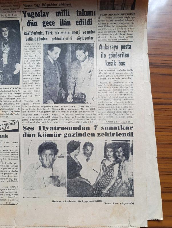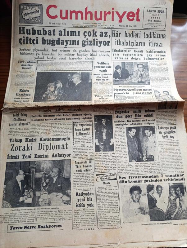 Cumhuriyet Gazetesi - 14 Ekim 1954 - Hububat Alımı Çok Az Çiftçi Buğdayını Gizliyor - Ticaret Vekili Zühtü Velibeşe Gene Makale Yazdı - Sümerbank Alım Satım Müessesi Müdürü Faruk Gönel Dünkü Toplantıda Konuşurken Fotoğraf - Yugoslav Milli Takımı Dün Gece İlan Edildi - Yakup Kadri Karaosmanoğlu Zoraki Diplomat İsimli Yeni Eserini Anlatıyor Fotoğraf - Ses Tiyatrosunda 7 Sanatkar Dün Kömür Gazından Zehirlendi - Ankara Bayramı Münasebetiyle Reisicumhur Celal Bayar'ı Ziyaret Eden Küçük Ankara Efeleri - 1001 Kuyu Yazan Va Nü Yazı Dizisi - Fransa Uçan Daire Memleketi Oldu - Şehir Tiyatrosu Temsilleri Rağbet Gördü - Milli Maça Dair Gündüz Kılıç'ın Demeci - Bu Haftaki Mühim Futbol Karşılaşması Fenerbahçe Beşiktaş - Bahçeden Bir Adam Girdi Yazan Perihan Zorlu Yazı Dizisi - Değerli Sanatkar Sabite Tur Gülerman Sarışın Bomba Gönül Yazar - Turkuaz Aile Saz Salonunda - Resimli Romanımız Doktorun Aşkı Yazan George Simenon - Gripin - Puro Tuvalet Sabunu - Caterpillar Traktör, Yunus Nadi tarafından kaleme alınmıştır. Cumhuriyet Gazetesi - 14 Ekim 1954 - Hububat Alımı Çok Az Çiftçi Buğdayını Gizliyor - Ticaret Vekili Zühtü Velibeşe Gene Makale Yazdı - Sümerbank Alım Satım Müessesi Müdürü Faruk Gönel Dünkü Toplantıda Konuşurken Fotoğraf - Yugoslav Milli Takımı Dün Gece İlan Edildi - Yakup Kadri Karaosmanoğlu Zoraki Diplomat İsimli Yeni Eserini Anlatıyor Fotoğraf - Ses Tiyatrosunda 7 Sanatkar Dün Kömür Gazından Zehirlendi - Ankara Bayramı Münasebetiyle Reisicumhur Celal Bayar'ı Ziyaret Eden Küçük Ankara Efeleri - 1001 Kuyu Yazan Va Nü Yazı Dizisi - Fransa Uçan Daire Memleketi Oldu - Şehir Tiyatrosu Temsilleri Rağbet Gördü - Milli Maça Dair Gündüz Kılıç'ın Demeci - Bu Haftaki Mühim Futbol Karşılaşması Fenerbahçe Beşiktaş - Bahçeden Bir Adam Girdi Yazan Perihan Zorlu Yazı Dizisi - Değerli Sanatkar Sabite Tur Gülerman Sarışın Bomba Gönül Yazar - Turkuaz Aile Saz Salonunda - Resimli Romanımız Doktorun Aşkı Yazan George Simenon - Gripin - Puro Tuvalet Sabunu - Caterpillar Traktör adlı eser Türkçe dilindedir.