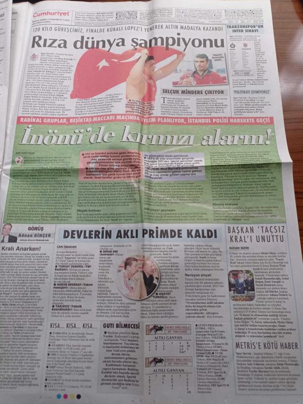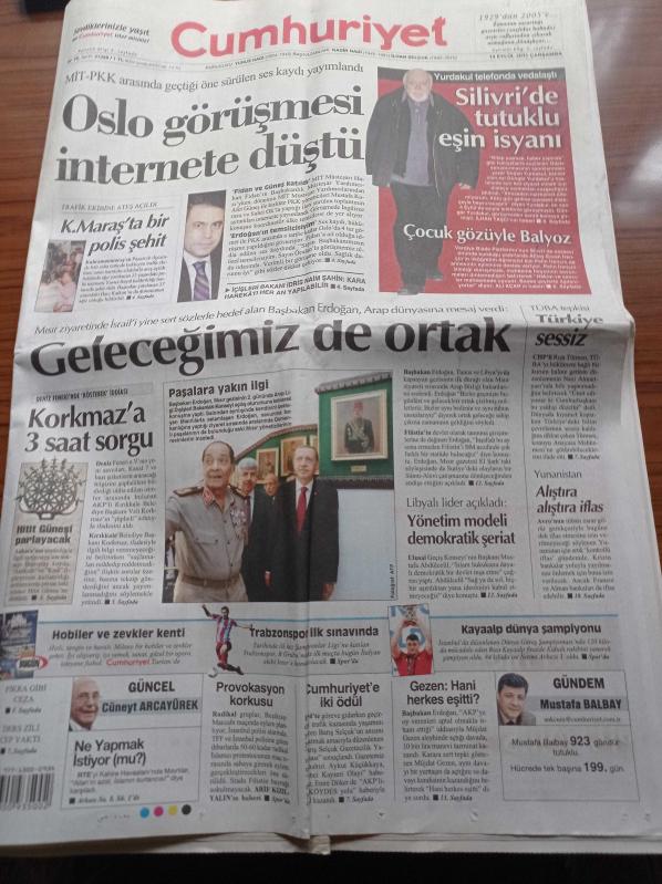 Cumhuriyet Gazetesi - 14 Eylül 2011 - Mit PKK Arasında Geçen Oslo Görüşmesi İnternete Düştü - Doğan Yurdakul Telefonla Vedalaştı - Başbakan Recep Tayyip Erdoğan'ın Mısır Gezisinde Paşalara Yakın İlgi - Deniz Fenerinde Köstebek İddiası - TÜBA Tepkisi Türkiye Sessiz - Hakan Fidan - Rıza Kayaalp Şampiyon - İçişleri Bakanı İdris Naim Şahin adlı eser Türkçe dilindedir.