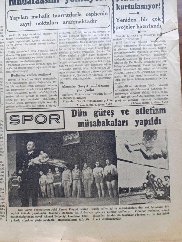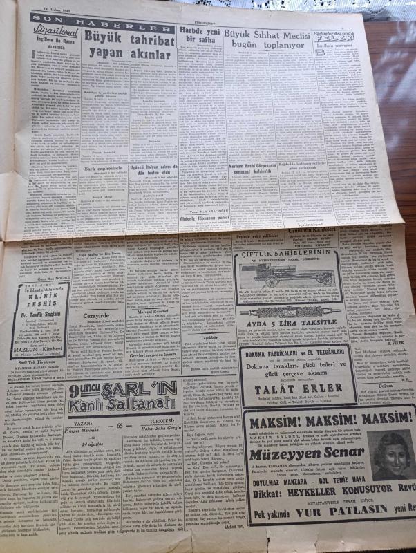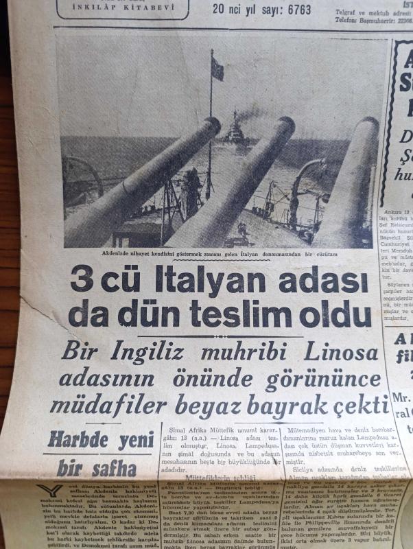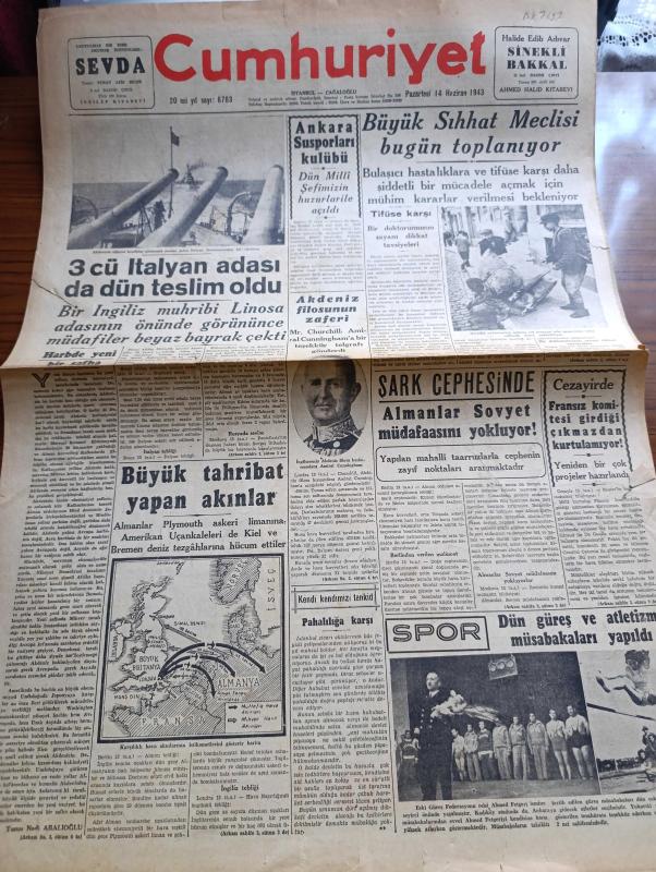 Cumhuriyet Gazetesi - 14 Haziran 1943 - Harbde Yeni Bir Safha Yazan Yunus Nadi Abalıoğlu Köşe Yazısı - 3. İtalyan Adası da Dün Teslim Oldu - Karşılıklı Hava Akınlarının İstikametlerini Gösterir Harita - Ankara Susporları Kulübü Dün Milli Şefimiz İsmet İnönü'nün Huzuru İle Açıldı - Büyük Sıhhat Meclisi Bugün Toplanıyor - Akdeniz Filosunun Zaferi - İngiltere Akdeniz Filosu Başkumandanı Amiral Cunningham - Eski Güreş Federasyonu Reisi Ahmed Fetgeri İsmine Tertib Edilen Güreş Müsabakaları Fotoğraf - Şark Cephesinde Almanlar Sovyet Müdafaasını Yokluyor - Bizde Tiyatro İdraki Yazan İ. Galip Arcan - Galatasaray Lisesi'nin Bayramı - Gary Cooper'in Son Kurşun İpek Sinemasında - 9. Şarl'ın Kanlı Saltanatı Yazan Prosper Merimee Yazı Dizisi - İstanbul İkinci Ağırceza Reisi Hasan Hasbi Gürpınar'ın Cenazesi Kaldırıldı - Bağdat'ta Birleşmiş Milletler Günü Kutlanacak - Bugünkü Radyo Programı - Bulmaca - Dermojen Yanık kremi - Belsoğukluğu İçin Belsatimol Kullanınız - Doktor Emin Şükrü Kunt adlı eser, Kitap > Süreli Yayınlar > Gazeteler > Türkiye > Genel > Günlük kategorisinde İkinci El olarak satıştadır.