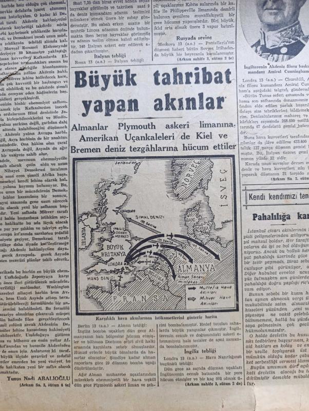 Cumhuriyet Gazetesi - 14 Haziran 1943 - Harbde Yeni Bir Safha Yazan Yunus Nadi Abalıoğlu Köşe Yazısı - 3. İtalyan Adası da Dün Teslim Oldu - Karşılıklı Hava Akınlarının İstikametlerini Gösterir Harita - Ankara Susporları Kulübü Dün Milli Şefimiz İsmet İnönü'nün Huzuru İle Açıldı - Büyük Sıhhat Meclisi Bugün Toplanıyor - Akdeniz Filosunun Zaferi - İngiltere Akdeniz Filosu Başkumandanı Amiral Cunningham - Eski Güreş Federasyonu Reisi Ahmed Fetgeri İsmine Tertib Edilen Güreş Müsabakaları Fotoğraf - Şark Cephesinde Almanlar Sovyet Müdafaasını Yokluyor - Bizde Tiyatro İdraki Yazan İ. Galip Arcan - Galatasaray Lisesi'nin Bayramı - Gary Cooper'in Son Kurşun İpek Sinemasında - 9. Şarl'ın Kanlı Saltanatı Yazan Prosper Merimee Yazı Dizisi - İstanbul İkinci Ağırceza Reisi Hasan Hasbi Gürpınar'ın Cenazesi Kaldırıldı - Bağdat'ta Birleşmiş Milletler Günü Kutlanacak - Bugünkü Radyo Programı - Bulmaca - Dermojen Yanık kremi - Belsoğukluğu İçin Belsatimol Kullanınız - Doktor Emin Şükrü Kunt, Yunus Nadi tarafından kaleme alınmıştır. Cumhuriyet Gazetesi - 14 Haziran 1943 - Harbde Yeni Bir Safha Yazan Yunus Nadi Abalıoğlu Köşe Yazısı - 3. İtalyan Adası da Dün Teslim Oldu - Karşılıklı Hava Akınlarının İstikametlerini Gösterir Harita - Ankara Susporları Kulübü Dün Milli Şefimiz İsmet İnönü'nün Huzuru İle Açıldı - Büyük Sıhhat Meclisi Bugün Toplanıyor - Akdeniz Filosunun Zaferi - İngiltere Akdeniz Filosu Başkumandanı Amiral Cunningham - Eski Güreş Federasyonu Reisi Ahmed Fetgeri İsmine Tertib Edilen Güreş Müsabakaları Fotoğraf - Şark Cephesinde Almanlar Sovyet Müdafaasını Yokluyor - Bizde Tiyatro İdraki Yazan İ. Galip Arcan - Galatasaray Lisesi'nin Bayramı - Gary Cooper'in Son Kurşun İpek Sinemasında - 9. Şarl'ın Kanlı Saltanatı Yazan Prosper Merimee Yazı Dizisi - İstanbul İkinci Ağırceza Reisi Hasan Hasbi Gürpınar'ın Cenazesi Kaldırıldı - Bağdat'ta Birleşmiş Milletler Günü Kutlanacak - Bugünkü Radyo Programı - Bulmaca - Dermojen Yanık kremi - Belsoğukluğu İçin Belsatimol Kullanınız - Doktor Emin Şükrü Kunt adlı eser Türkçe dilindedir.
