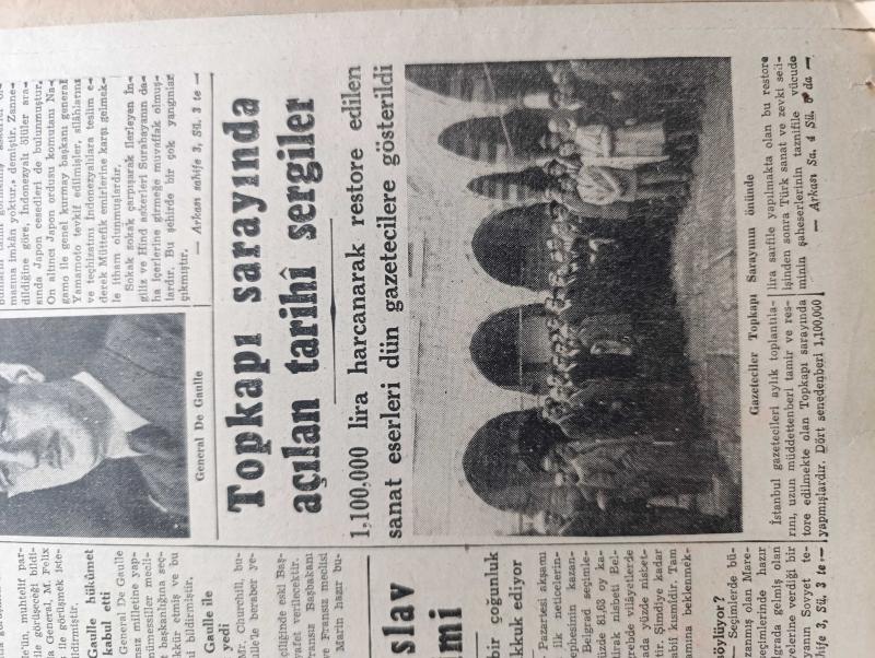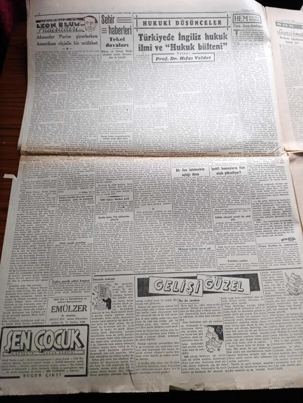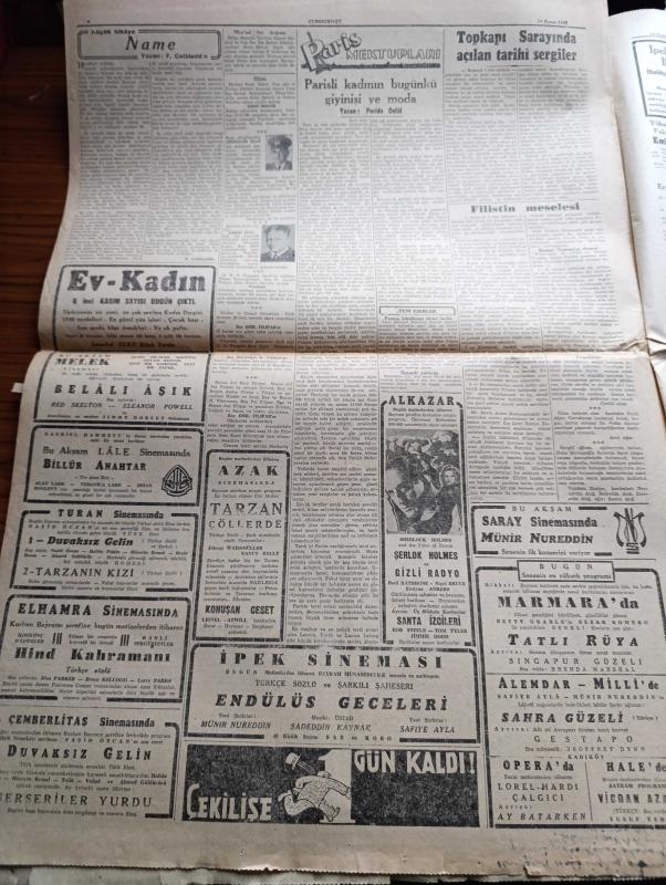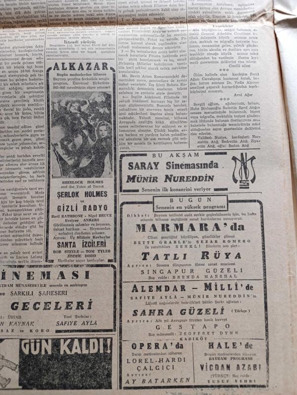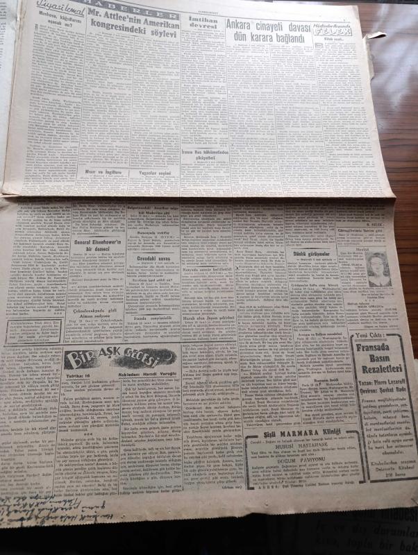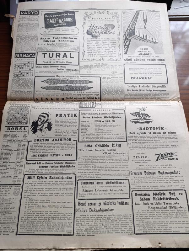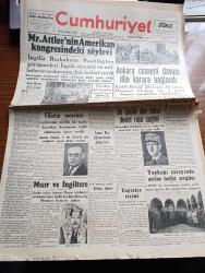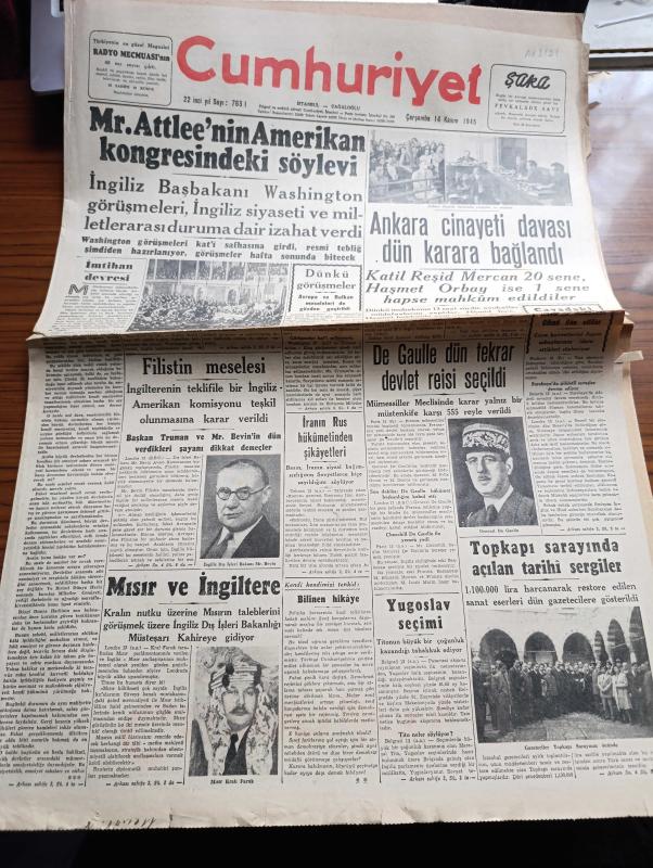 Cumhuriyet Gazetesi - 14 Kasım 1945 - İngiliz Başbakanı Mr. Attlee'nin Amerikan Kongresi deki Söylevi - Filistin Meselesi - Ankara Cinayeti Davası Dün Karara Bağlandı - Katil Reşid Mercan 20 Sene Haşmet Orbay İse 1 Sene Hapse Mahkum Edildi - De Gaulle Dün Tekrar Devlet Reisi Seçildi - Topkapı Sarayında Açılan Tarihi Sergiler Fotoğraf - Yugoslav Seçimi Tito'nun Büyük Bir Çoğunluk Kazandığı Tahakkuk Ediyor - Tekel Davaları - Uğursuz Yıl Leon Blum'un Hatıraları Yazı Dizisi - Bir Aşk Gecesi Nakleden Hamdi Varoğlu Yazı Dizisi - Kitap Saati Yazan Burhan Felek Köşe Yazısı - Sherlock Holmes Ve Gizli Radyo Alkazar Sinemasında - Endülüs Geceleri İpek Sinemasında - Münir Nurettin Senenin İlk Konseri Saray Sinemasında - Bugünkü Radyo Programı - Öksürük Ve Bronşite Karşı Tural - Hasan Parfümleri - İstanbul Belediyesi Şehir Tiyatrosu Komedi Kısmında Söylemeli Mi Dram Kısmında Sanatkar Aşkı Oyunu - Borsa - Singer Saatleri adlı eser, Kitap > Süreli Yayınlar > Gazeteler > Türkiye > Genel > Günlük kategorisinde İkinci El olarak satıştadır.