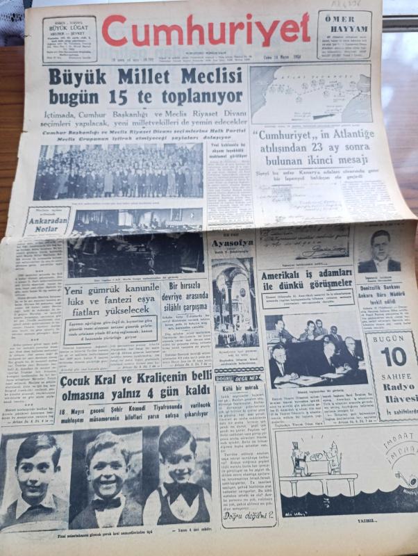 Cumhuriyet Gazetesi - 14 Mayıs 1954 - Meclisin Açılma Arifesinde Ankara'dan Notlar Doğan Nadi Bildiriyor - Büyük Millet Meclisi Bugün 15 te Toplanıyor - Cumhuriyet'in Atlantiğe Atılışından 23 Ay Sonra Bulunan İkinci Mesajı - Çocuk Kral Ve Kraliçe'nin Belli Olmasına Yalnız 4 Gün Kaldı - Denizcilik Bankası Ankara Büro Müdürü Raşid Karaca Tevkif Edildi - İnce Memed Yazan Yaşar Kemal Yazı Dizisi - Amerika'dan Getirilen Hindi Yavruları Yazan Süreyya Özek - Burhan Felek Köşe Yazısı - İran'ın Rusya'ya Notası - Ali Baba Ve 40 Haramiler Filme Alınıyor - Büyük Adli Hatalar Çeviren Mazhar Kunt Yazı Dizisi - Futbol Milli Takım Seçme Azası Niyazi Sel İstifasını Verdi - Harika İngiliz Atleti Bannister Kendi Rekorunu Kendim Kıracağım Dedi - Cumhuriyet Radyo Programları Eki - Meşhur Şarkıcı Rita Paul - Beyaz Sarayın Radyo Ve Televizyon Müşaviri Robert Montgomery - Kraliçe Elizabeth 173 günlük Seyahatini Bugün Tamamlıyor - Sarayların Aşk İlahesi Desiree Yazan Anne Marie Selinko Yazı Dizisi - Gripin adlı eser, Kitap > Süreli Yayınlar > Gazeteler > Türkiye > Genel > Günlük kategorisinde İkinci El olarak satıştadır.