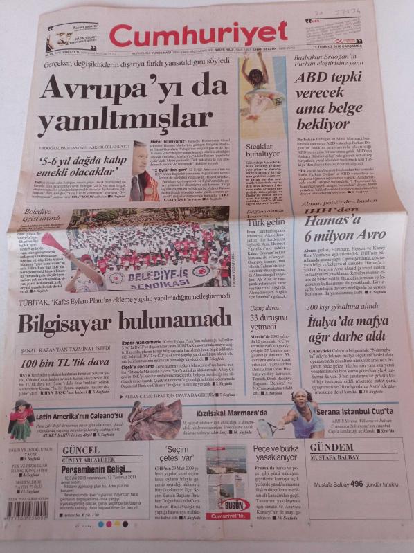 Cumhuriyet Gazetesi - 14 Temmuz 2010 - İspanya Dünya Şampiyonu - İstanbul CUP'a Yıldız Yağacak - Atletizmde Madalyalar Yolda - Kelaynak Göç Yolunda - Kafes Eylem Planı - TÜBİTAK - Kızılsakal Marmara'da - İtalya'da Mafya Ağır Darbe Aldı - Serena Williams adlı eser Türkçe dilindedir.