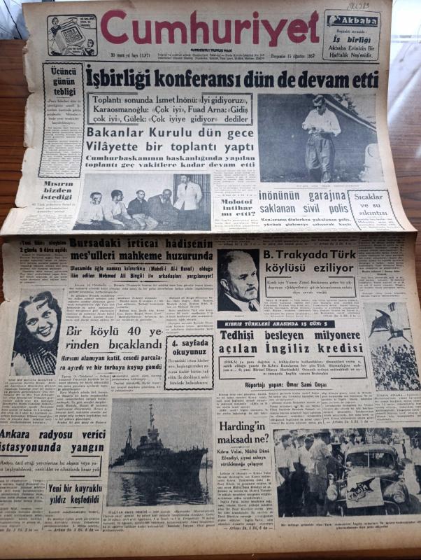 Cumhuriyet Gazetesi - 15 Ağustos 1957 - İşbirliği Konferansı Dün De Devam Etti - Toplantı Sonunda İsmet İnönü İyi Gidiyoruz Dedi - Yakup Kadri Karaosmanoğlu Fuad Arna Ve Kasım Gülek Toplantı Çok İyi Gidiyor Dedi - İsmet İnönü'nün Garajına Saklanan Sivil Polis - Bursa'nın İrticai Hadise'nin Mesulleri Mahkeme Huzurunda - Molotof İntihar Mı Etti - Batı Trakya'da Türk Köylüsü Eziliyor - Kıbrıs Türkleri Arasında 15 Gün Röportajı Yapan Ömer Sami Coşar Yazı Dizisi - Müftü Dana - Doktor Fazıl Küçük - Mussolini'nin Hakiki Hatıraları Bulundu Ve Tekrar Kayboldu - Tarabyadaki İnşa Halindeki Oteli Emekli Sandığı Aldı - 7. Kore Değiştirme Birliğimiz Geldi - İstanbul'un Suyu Sapanca Gölünden Sağlanacak - Başbakan Adnan Menderes İzmir Fuarına Gidiyor - Fay Temizleme Tozu - Krem Pertev - Fenerbahçeliler Cemiyetinden İstifa Etmeyen Fenerliler Haysiyet Divanına Verilecek - Akdeniz Yüzme Yarışları - Beşiktaş Yarın Ankara'ya Gidiyor - Basketbol Milli Takımı İtalya Milli Takımı İle Oynayacak - Pan American, Yunus Nadi tarafından kaleme alınmıştır. Cumhuriyet Gazetesi - 15 Ağustos 1957 - İşbirliği Konferansı Dün De Devam Etti - Toplantı Sonunda İsmet İnönü İyi Gidiyoruz Dedi - Yakup Kadri Karaosmanoğlu Fuad Arna Ve Kasım Gülek Toplantı Çok İyi Gidiyor Dedi - İsmet İnönü'nün Garajına Saklanan Sivil Polis - Bursa'nın İrticai Hadise'nin Mesulleri Mahkeme Huzurunda - Molotof İntihar Mı Etti - Batı Trakya'da Türk Köylüsü Eziliyor - Kıbrıs Türkleri Arasında 15 Gün Röportajı Yapan Ömer Sami Coşar Yazı Dizisi - Müftü Dana - Doktor Fazıl Küçük - Mussolini'nin Hakiki Hatıraları Bulundu Ve Tekrar Kayboldu - Tarabyadaki İnşa Halindeki Oteli Emekli Sandığı Aldı - 7. Kore Değiştirme Birliğimiz Geldi - İstanbul'un Suyu Sapanca Gölünden Sağlanacak - Başbakan Adnan Menderes İzmir Fuarına Gidiyor - Fay Temizleme Tozu - Krem Pertev - Fenerbahçeliler Cemiyetinden İstifa Etmeyen Fenerliler Haysiyet Divanına Verilecek - Akdeniz Yüzme Yarışları - Beşiktaş Yarın Ankara'ya Gidiyor - Basketbol Milli Takımı İtalya Milli Takımı İle Oynayacak - Pan American adlı eser Türkçe dilindedir.