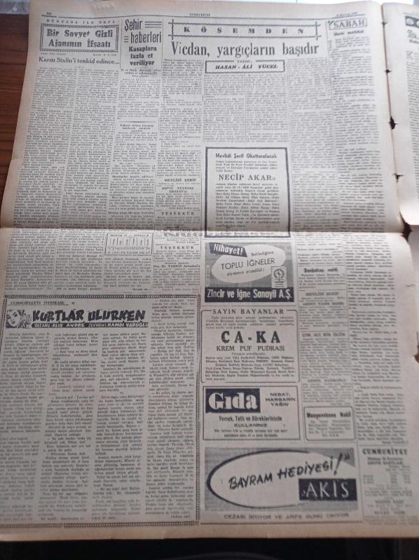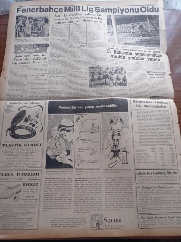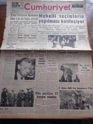 Cumhuriyet Gazetesi - 15 Haziran 1959 - Yeni Veraset Kanunu Dün Yürürlüğe Girdi - Mahalli Seçimlerin Yapılması Katileşiyor - Grekoromende Balkan Şampiyonuyuz - Kasım Gülek Adana'da Konuştu - Batı Almanya Başbakanı Adenauer'e Göre İhtilaf Sona Erdi - Münevver Din Adamı İhtiyacı - Hasan Ali Yücel Köşe Yazısı - Dünyada İlk Defa Bir Sovyet Gizli Ajanının İfşaatı Yazı Dizisi - Kurtlar Ulurken Yazan Alix Andre Yazı Dizisi - Hindistan'da Komünizm Aleyhtarı Nümayişler - Bedri Rahmi Eyüboğlu Pazartesi Konuşmaları - Burhan Felek - Uluç Ali Yazan Halikarnas Balıkçısı Yazı Dizisi - Haftalık Radyo Programı - Fenerbahçe Milli Lig Şampiyonu Oldu - Fenerbahçe'nin Şampiyonluğu Yurdda Yankılar Yarattı - Fenerbahçe Federasyon Başkanı Faik Gökay'ın Elinden Şampiyonluk Kupasını Aldı - Ankara'daki Bisiklet Yarışları adlı eser, Kitap > Süreli Yayınlar > Gazeteler > Türkiye > Genel > Günlük kategorisinde İkinci El olarak satıştadır.