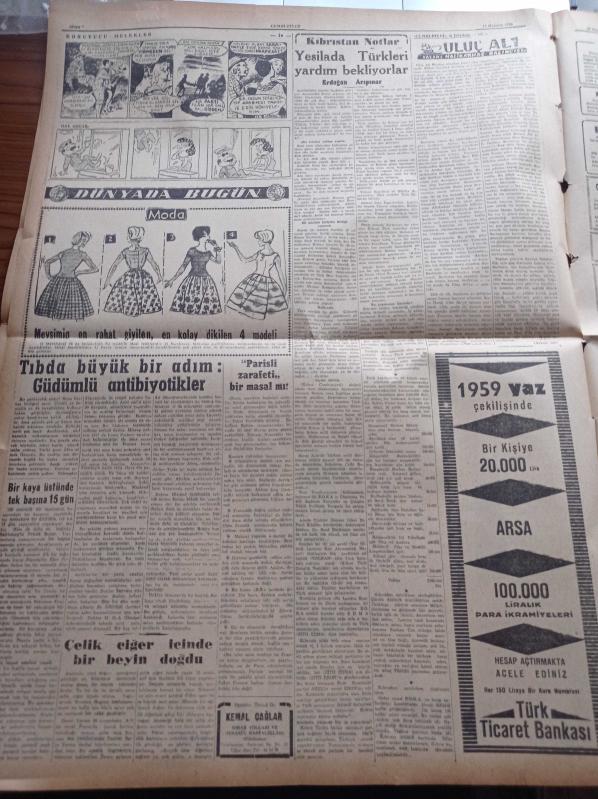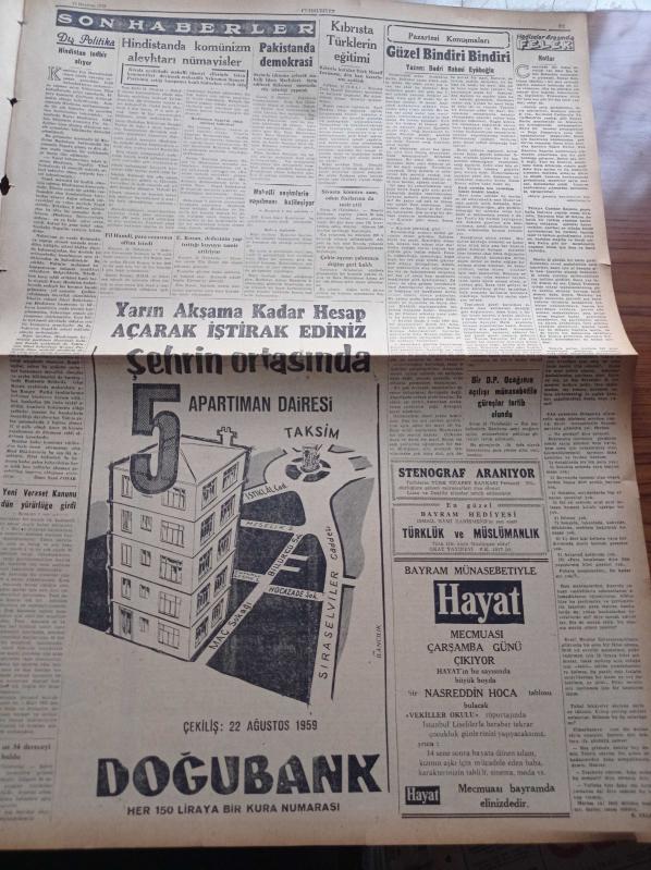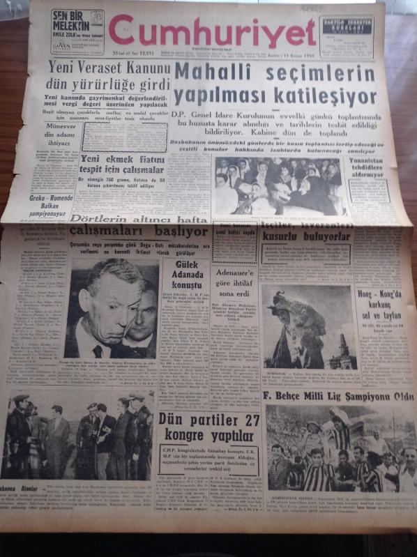 Cumhuriyet Gazetesi - 15 Haziran 1959 - Yeni Veraset Kanunu Dün Yürürlüğe Girdi - Mahalli Seçimlerin Yapılması Katileşiyor - Grekoromende Balkan Şampiyonuyuz - Kasım Gülek Adana'da Konuştu - Batı Almanya Başbakanı Adenauer'e Göre İhtilaf Sona Erdi - Münevver Din Adamı İhtiyacı - Hasan Ali Yücel Köşe Yazısı - Dünyada İlk Defa Bir Sovyet Gizli Ajanının İfşaatı Yazı Dizisi - Kurtlar Ulurken Yazan Alix Andre Yazı Dizisi - Hindistan'da Komünizm Aleyhtarı Nümayişler - Bedri Rahmi Eyüboğlu Pazartesi Konuşmaları - Burhan Felek - Uluç Ali Yazan Halikarnas Balıkçısı Yazı Dizisi - Haftalık Radyo Programı - Fenerbahçe Milli Lig Şampiyonu Oldu - Fenerbahçe'nin Şampiyonluğu Yurdda Yankılar Yarattı - Fenerbahçe Federasyon Başkanı Faik Gökay'ın Elinden Şampiyonluk Kupasını Aldı - Ankara'daki Bisiklet Yarışları, Yunus Nadi tarafından kaleme alınmıştır. Cumhuriyet Gazetesi - 15 Haziran 1959 - Yeni Veraset Kanunu Dün Yürürlüğe Girdi - Mahalli Seçimlerin Yapılması Katileşiyor - Grekoromende Balkan Şampiyonuyuz - Kasım Gülek Adana'da Konuştu - Batı Almanya Başbakanı Adenauer'e Göre İhtilaf Sona Erdi - Münevver Din Adamı İhtiyacı - Hasan Ali Yücel Köşe Yazısı - Dünyada İlk Defa Bir Sovyet Gizli Ajanının İfşaatı Yazı Dizisi - Kurtlar Ulurken Yazan Alix Andre Yazı Dizisi - Hindistan'da Komünizm Aleyhtarı Nümayişler - Bedri Rahmi Eyüboğlu Pazartesi Konuşmaları - Burhan Felek - Uluç Ali Yazan Halikarnas Balıkçısı Yazı Dizisi - Haftalık Radyo Programı - Fenerbahçe Milli Lig Şampiyonu Oldu - Fenerbahçe'nin Şampiyonluğu Yurdda Yankılar Yarattı - Fenerbahçe Federasyon Başkanı Faik Gökay'ın Elinden Şampiyonluk Kupasını Aldı - Ankara'daki Bisiklet Yarışları adlı eser Türkçe dilindedir.