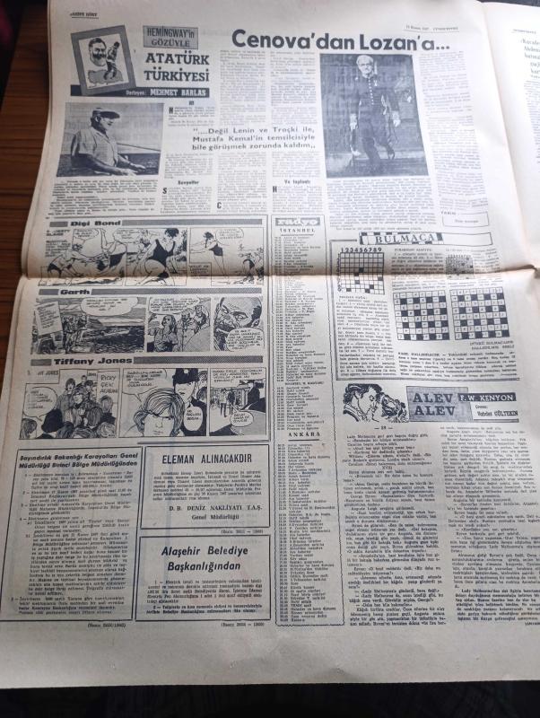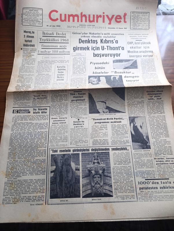 Cumhuriyet Gazetesi - 15 Kasım 1967 - Dış Ticarette Büyük Laflar Yazan Ecvet Güresin Başmakale - Maraş'ta 2 Alman Turisti Öldürüldü - Vehbi Koç Başbakanla Konuştuktan Sonra Buzdolabı Fiyatında İndirim Artış Olmaz Dedi - Rauf Denktaş Kıbrıs'a Girmek İçin U Thant'a Başvuruyor - Piyasadaki Bütün Köseleler Bozuktur Damgası Taşıyor - Emekli Albay Sadettin Suhataç Başkanlığında Kurulan Demokrat Birlik Partisi Programını Açıkladı - Vietnam Salhanesi Yazan İlhan Selçuk Köşe - İngiltere Başbakanı Wilson Ortak Pazara Acil Çağrıda Bulundu - Ho Şi Minh Lenin Nişanını Zaferi Kazandıktan Sonra Alacağım Dedi - 50. Yıldönümünde 1917 İhtilalinin Hikayesi Çizgi Roman - Ernest Hemingway'in Gözüyle Atatürk Türkiyesi Derleyen Mehmet Barlas Yazı Dizisi - İtalyan Lisesinde Atatürk Büstü Açıldı - Ulvi Uraz Tiyatrosu - Sophia Loren Yeni Filminin Galasına Şahane Bir Kıyafet Ve Merasimle Geldi - Deli Dolu Oyunundan Bir Sahne - Aziz Basmacı - Kenan Büke - Tek Şampiyon Ahmet Ayık Delhi'de Zorla 5. Olabildik, Yunus Nadi tarafından kaleme alınmıştır. Cumhuriyet Gazetesi - 15 Kasım 1967 - Dış Ticarette Büyük Laflar Yazan Ecvet Güresin Başmakale - Maraş'ta 2 Alman Turisti Öldürüldü - Vehbi Koç Başbakanla Konuştuktan Sonra Buzdolabı Fiyatında İndirim Artış Olmaz Dedi - Rauf Denktaş Kıbrıs'a Girmek İçin U Thant'a Başvuruyor - Piyasadaki Bütün Köseleler Bozuktur Damgası Taşıyor - Emekli Albay Sadettin Suhataç Başkanlığında Kurulan Demokrat Birlik Partisi Programını Açıkladı - Vietnam Salhanesi Yazan İlhan Selçuk Köşe - İngiltere Başbakanı Wilson Ortak Pazara Acil Çağrıda Bulundu - Ho Şi Minh Lenin Nişanını Zaferi Kazandıktan Sonra Alacağım Dedi - 50. Yıldönümünde 1917 İhtilalinin Hikayesi Çizgi Roman - Ernest Hemingway'in Gözüyle Atatürk Türkiyesi Derleyen Mehmet Barlas Yazı Dizisi - İtalyan Lisesinde Atatürk Büstü Açıldı - Ulvi Uraz Tiyatrosu - Sophia Loren Yeni Filminin Galasına Şahane Bir Kıyafet Ve Merasimle Geldi - Deli Dolu Oyunundan Bir Sahne - Aziz Basmacı - Kenan Büke - Tek Şampiyon Ahmet Ayık Delhi'de Zorla 5. Olabildik adlı eser Türkçe dilindedir.
