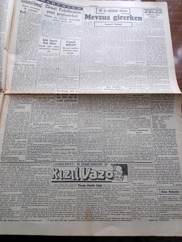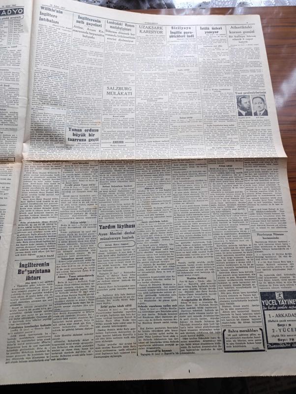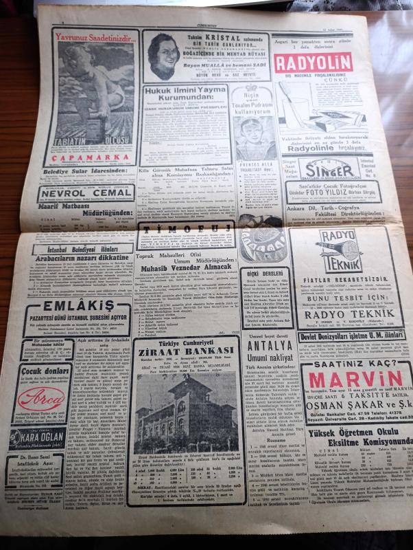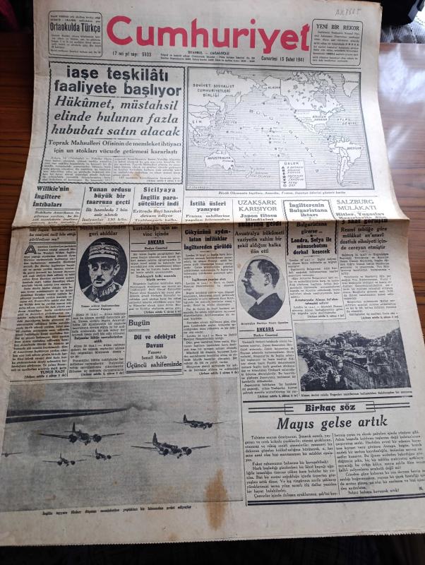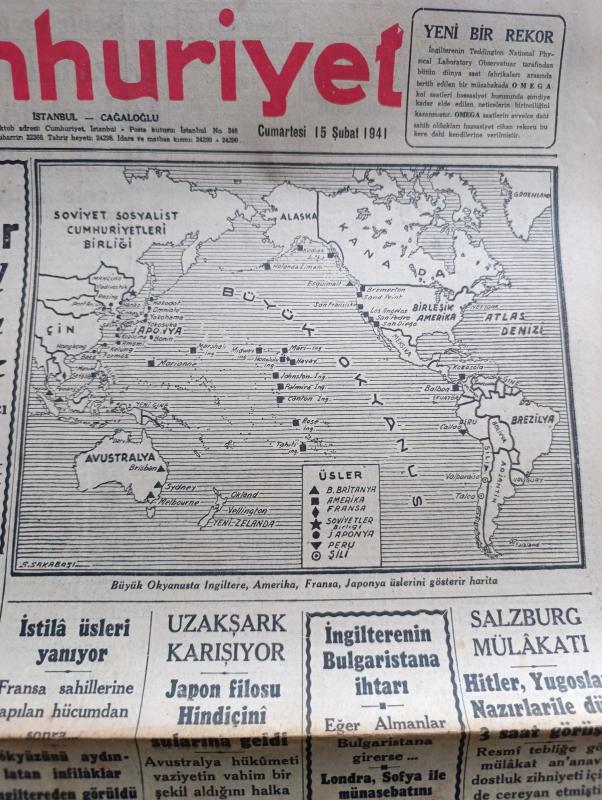 Cumhuriyet Gazetesi - 15 Şubat 1941 - Büyük Okyanusta İngiltere Amerika Fransa Japonya Üslerini Gösterir Harita - İaşe Teşkilatı Faaliyete Başlıyor - Hükümet Müstakil Elinde Bulunan Fazla Hububatı Satın Alacak - Willkie'nin İngiltere İntibaları Yazan Yunus Nadi Başmakale - Yunan Ordusu Büyük Bir Taarruza Geçti - Sicilyaya İngiliz Paraşütçüleri İndi - İngiliz Tayyare Filoları Düşman Memleketine Yaptıkları Bir Hücumdan Avdet Ediyorlar Fotoğrafı - Uzakşark Karışıyor Japon Filosu Hindiçini Sularına Geldi - Salzburg Mülakatı Hitler Yugoslav Nazırlarıyla Dün 3 Saat Görüştü - Büyük Muasırlar Yazan Winston Churchill Yazı Dizisi - Şair Nedim'in Harap Mezarını İstanbulu Sevenler Cemiyeti Tamir Ettirecek - Kızıl Vazo Yazan Peride Celal Yazı Dizisi - Dil Ve Edebiyat Davası Yazan İsmail Habib - Dilimize Göre Kalıplarız Yazan Burhan Felek Köşe Yazısı - Maria Rökk'ün Canlı Gerdanlığı Fotoğraf - Senenin En Mühim Maçı Beşiktaş Fenerbahçe - Sihirbaz Yazan Somerset Maugham Yazı Dizisi - Leyla ile Mecnun adlı eser, Kitap > Süreli Yayınlar > Gazeteler > Türkiye > Genel > Günlük kategorisinde İkinci El olarak satıştadır.