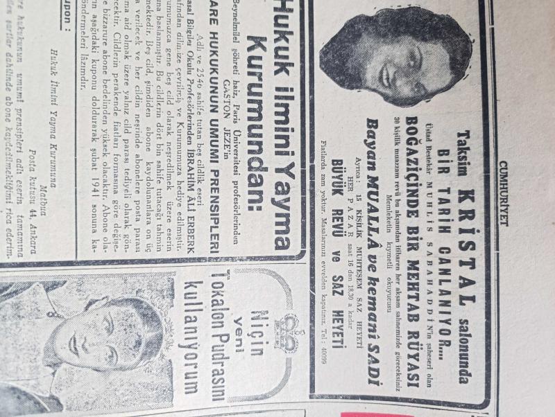 Cumhuriyet Gazetesi - 15 Şubat 1941 - Büyük Okyanusta İngiltere Amerika Fransa Japonya Üslerini Gösterir Harita - İaşe Teşkilatı Faaliyete Başlıyor - Hükümet Müstakil Elinde Bulunan Fazla Hububatı Satın Alacak - Willkie'nin İngiltere İntibaları Yazan Yunus Nadi Başmakale - Yunan Ordusu Büyük Bir Taarruza Geçti - Sicilyaya İngiliz Paraşütçüleri İndi - İngiliz Tayyare Filoları Düşman Memleketine Yaptıkları Bir Hücumdan Avdet Ediyorlar Fotoğrafı - Uzakşark Karışıyor Japon Filosu Hindiçini Sularına Geldi - Salzburg Mülakatı Hitler Yugoslav Nazırlarıyla Dün 3 Saat Görüştü - Büyük Muasırlar Yazan Winston Churchill Yazı Dizisi - Şair Nedim'in Harap Mezarını İstanbulu Sevenler Cemiyeti Tamir Ettirecek - Kızıl Vazo Yazan Peride Celal Yazı Dizisi - Dil Ve Edebiyat Davası Yazan İsmail Habib - Dilimize Göre Kalıplarız Yazan Burhan Felek Köşe Yazısı - Maria Rökk'ün Canlı Gerdanlığı Fotoğraf - Senenin En Mühim Maçı Beşiktaş Fenerbahçe - Sihirbaz Yazan Somerset Maugham Yazı Dizisi - Leyla ile Mecnun, Yunus Nadi tarafından kaleme alınmıştır. Cumhuriyet Gazetesi - 15 Şubat 1941 - Büyük Okyanusta İngiltere Amerika Fransa Japonya Üslerini Gösterir Harita - İaşe Teşkilatı Faaliyete Başlıyor - Hükümet Müstakil Elinde Bulunan Fazla Hububatı Satın Alacak - Willkie'nin İngiltere İntibaları Yazan Yunus Nadi Başmakale - Yunan Ordusu Büyük Bir Taarruza Geçti - Sicilyaya İngiliz Paraşütçüleri İndi - İngiliz Tayyare Filoları Düşman Memleketine Yaptıkları Bir Hücumdan Avdet Ediyorlar Fotoğrafı - Uzakşark Karışıyor Japon Filosu Hindiçini Sularına Geldi - Salzburg Mülakatı Hitler Yugoslav Nazırlarıyla Dün 3 Saat Görüştü - Büyük Muasırlar Yazan Winston Churchill Yazı Dizisi - Şair Nedim'in Harap Mezarını İstanbulu Sevenler Cemiyeti Tamir Ettirecek - Kızıl Vazo Yazan Peride Celal Yazı Dizisi - Dil Ve Edebiyat Davası Yazan İsmail Habib - Dilimize Göre Kalıplarız Yazan Burhan Felek Köşe Yazısı - Maria Rökk'ün Canlı Gerdanlığı Fotoğraf - Senenin En Mühim Maçı Beşiktaş Fenerbahçe - Sihirbaz Yazan Somerset Maugham Yazı Dizisi - Leyla ile Mecnun adlı eser Türkçe dilindedir.