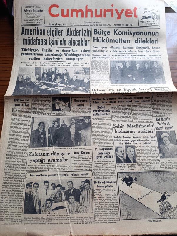 Cumhuriyet Gazetesi - 15 Şubat 1951 - Bilim Ve Politika Yazan Nadir Nadi Köşe Yazısı - Amerikan Elçileri Akdenizin Müdafaası İşini Ele Alacaklar - Bütçe Komisyonunun Hükümetten Dilekleri - Ortaşarkın En Büyük Hava Limanı Türkiye'de Olacak - İdil Biret'in Paris'te İlk Umumi Konseri - Kore'de Savaşlar - Tanınmış Film Rejisörü Faruk Kenç'inb Başına Gelenler - Kore Yaralılarına Gazetemiz Vasıtasıyla Yollanan Yemişler Fotoğraf - Beyaz Ruslar Kızıllaşıyor Mu Yazan Mirza Bala Köşe Yazısı - Latin Amerika İntibaları Yazan Fuad Carım Yazı Dizisi - Bahar Yazdan Sonra Gelir Nakleden Vahdet Gültekin - Köy Enstitüleri Öğretmen Okulu Haline Getirilecek - Amerika İspanya'ya Ödünç Para Verdi - Masonluğun Yasak Edilmesine Dair Teklif Reddedildi - Kadın Gazeteci Lil'in Maceraları Çizgi Roman - Bu Akşam Yapılacak Boks Karşılaşmaları - Bu Hafta Yapılacak Basketbol Ve Voleybol Maçları - Samsun'da Ziraat Koleji Kurulacak - İstanbul Ankara Radyosu Programı - Siera Radyoları - Mazon Meyva Tuzu - Pa Ro Mama