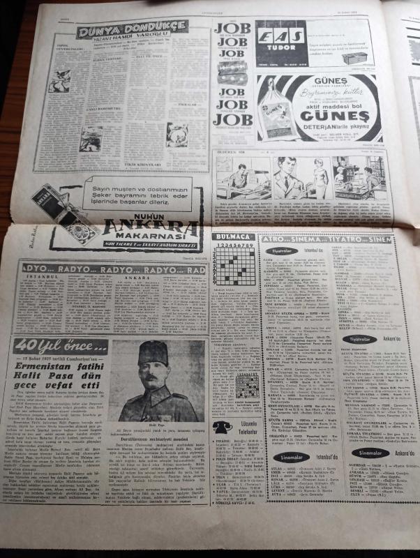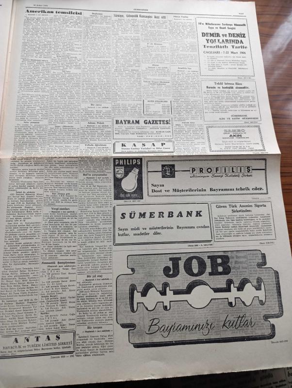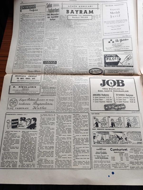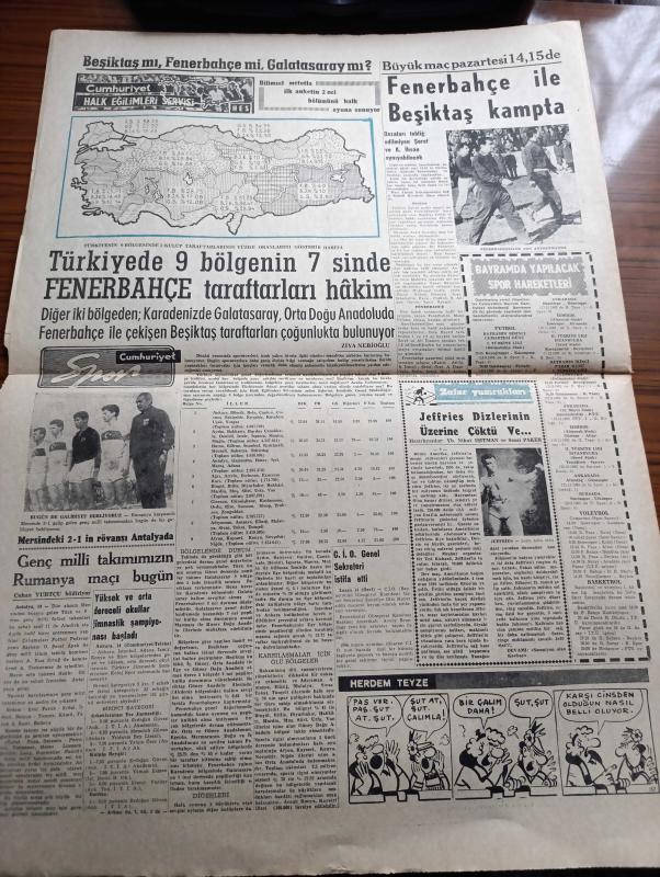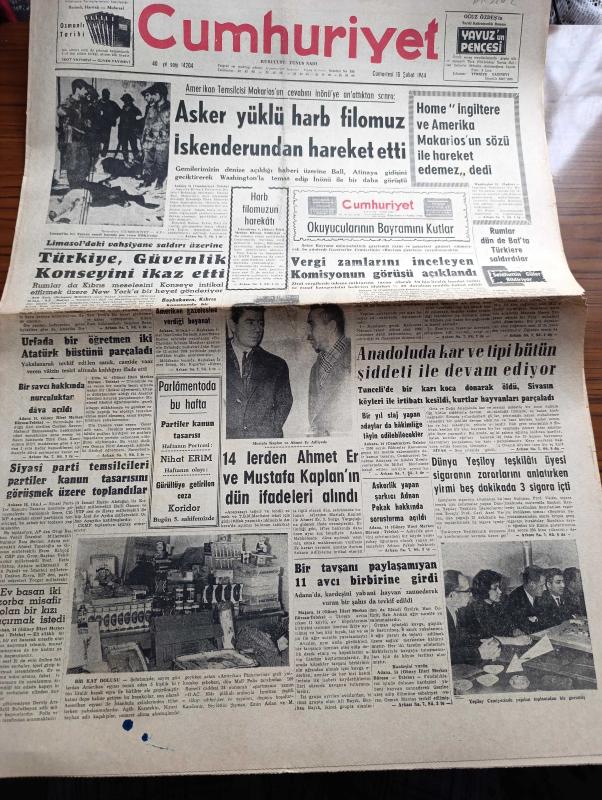 Cumhuriyet Gazetesi - 15 Şubat 1964 - Asker Yüklü Harp Filomuz İskenderun'dan Hareket Etti - Limasol'da Bir Türk'ün Cesedi Başında Poz Veren EOKA'cılar Fotoğrafı - Urfa'da Osman Nuri Amasyalı İsimli Bir Öğretmen İki Atatürk Büstünü Parçaladı - 14 lerden Ahmet Er Ve Mustafa Kaplan'ın Dün İfadeleri Alındı Fotoğraf - Askerlik Yapan Şarkıcı Adnan Pekak Hakkında Soruşturma Açıldı - Dünya Yeşilay Teşkilatı Üyesi Carl Axel Valen Sigaranın Zararlarını Anlatırken 3 Sigara İçti Fotoğraf - Yağma Yazan İlhan Selçuk Köşe Yazısı - Bayram Yazan Burhan Felek - Talabani Başkanlığında Bir Kürt Heyeti Bağdata Geliyor - 15 Şubat 1925 Tarihli Cumhuriyetten Ermenistan Fatihi Halit Paşa Dün Gece Vefat Etti - Kazova Giyimde Zerafet - Mutlu Akü - Büyük Maç İçin Fenerbahçe İle Beşiktaş Kampta - Türkiyede 9 Bölgenin 7 sinde Fenerbahçe Taraftarları Hakim - Taraftar Yüzde Oranlarını Gösterir Harita - Zafer Yumrukları Hazırlayanlar Nihat Işıtman Ve Sezai Paker, Yunus Nadi tarafından kaleme alınmıştır. Cumhuriyet Gazetesi - 15 Şubat 1964 - Asker Yüklü Harp Filomuz İskenderun'dan Hareket Etti - Limasol'da Bir Türk'ün Cesedi Başında Poz Veren EOKA'cılar Fotoğrafı - Urfa'da Osman Nuri Amasyalı İsimli Bir Öğretmen İki Atatürk Büstünü Parçaladı - 14 lerden Ahmet Er Ve Mustafa Kaplan'ın Dün İfadeleri Alındı Fotoğraf - Askerlik Yapan Şarkıcı Adnan Pekak Hakkında Soruşturma Açıldı - Dünya Yeşilay Teşkilatı Üyesi Carl Axel Valen Sigaranın Zararlarını Anlatırken 3 Sigara İçti Fotoğraf - Yağma Yazan İlhan Selçuk Köşe Yazısı - Bayram Yazan Burhan Felek - Talabani Başkanlığında Bir Kürt Heyeti Bağdata Geliyor - 15 Şubat 1925 Tarihli Cumhuriyetten Ermenistan Fatihi Halit Paşa Dün Gece Vefat Etti - Kazova Giyimde Zerafet - Mutlu Akü - Büyük Maç İçin Fenerbahçe İle Beşiktaş Kampta - Türkiyede 9 Bölgenin 7 sinde Fenerbahçe Taraftarları Hakim - Taraftar Yüzde Oranlarını Gösterir Harita - Zafer Yumrukları Hazırlayanlar Nihat Işıtman Ve Sezai Paker adlı eser Türkçe dilindedir.