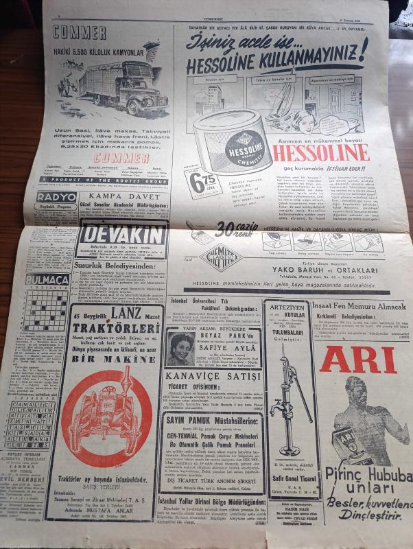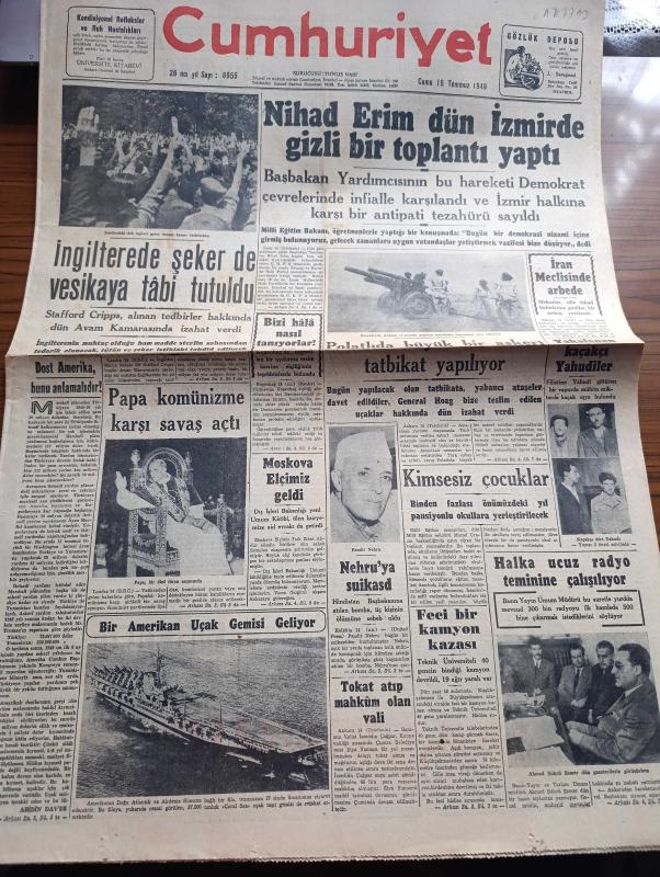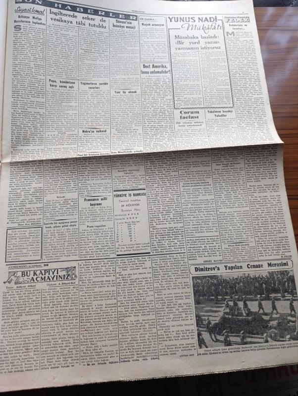 Cumhuriyet Gazetesi - 15 Temmuz 1949 - Dost Amerika Bunu Anlamalıdır Yazan Abidin Daver Köşe Yazısı - İngiltere'de Şeker De Vesikaya Tabi Tutuldu - Nihat Erim Dün İzmir'de Gizli Bir Toplantı Yaptı - Hindistan Başbakanı Pandit Nehru'ya Suikast - Papa Komünizme Karşı Savaş Açtı - Kaçakçı Yahudiler - Halka Ucuz Radyo Teminine Çalışılıyor - Şeref Duygusu Yazan Ordinaryüs Profesör Doktor Hıfzı Veldet - Camilerimiz - Güreşlerin Filmi Hafif Sıklet Ve Servet Meriç Yazan İsmail Habib Sevük - Bu Kapıyı Açmayınız Yazan Anthony Gilbert Yazı Dizisi - Dimitrov'a Sofyada Yapılan Cenaze Töreni - Borsa - Türkiye Bisiklet Sürat Yarışı Dün Yapıldı - Futbolda Transfer Pazarı Bütün Harareti yönelik Devam Ediyor - D'roja Briyantin - Sulfaderme Yara Merhemi - Üstad Münir Nurettin Kalamış Kulübünde - Safiye Ayla Büyükdere Beyazparkta - Bugünkü Radyo Programı - Hessoline Boya, Yunus Nadi tarafından kaleme alınmıştır. Cumhuriyet Gazetesi - 15 Temmuz 1949 - Dost Amerika Bunu Anlamalıdır Yazan Abidin Daver Köşe Yazısı - İngiltere'de Şeker De Vesikaya Tabi Tutuldu - Nihat Erim Dün İzmir'de Gizli Bir Toplantı Yaptı - Hindistan Başbakanı Pandit Nehru'ya Suikast - Papa Komünizme Karşı Savaş Açtı - Kaçakçı Yahudiler - Halka Ucuz Radyo Teminine Çalışılıyor - Şeref Duygusu Yazan Ordinaryüs Profesör Doktor Hıfzı Veldet - Camilerimiz - Güreşlerin Filmi Hafif Sıklet Ve Servet Meriç Yazan İsmail Habib Sevük - Bu Kapıyı Açmayınız Yazan Anthony Gilbert Yazı Dizisi - Dimitrov'a Sofyada Yapılan Cenaze Töreni - Borsa - Türkiye Bisiklet Sürat Yarışı Dün Yapıldı - Futbolda Transfer Pazarı Bütün Harareti yönelik Devam Ediyor - D'roja Briyantin - Sulfaderme Yara Merhemi - Üstad Münir Nurettin Kalamış Kulübünde - Safiye Ayla Büyükdere Beyazparkta - Bugünkü Radyo Programı - Hessoline Boya adlı eser Türkçe dilindedir.