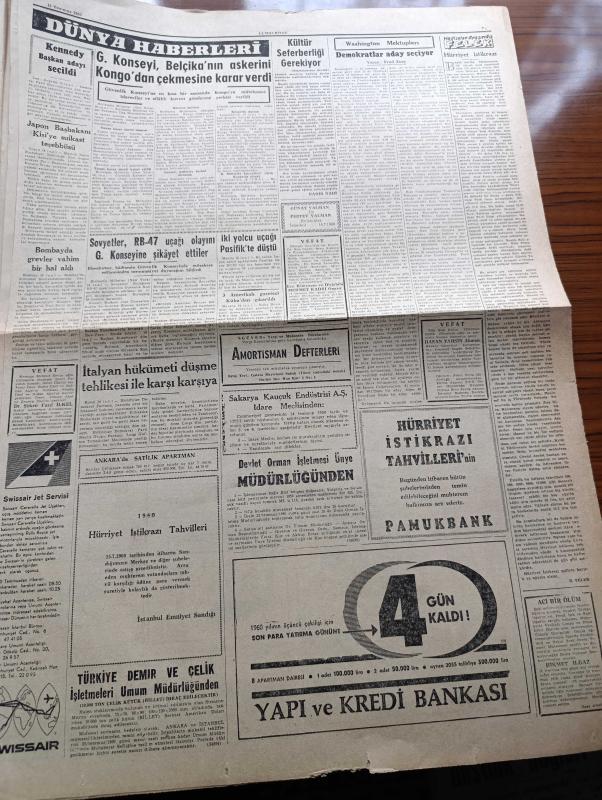 Cumhuriyet Gazetesi - 15 Temmuz 1960 - Kültür Seferberliği Gerekiyor Yazan Nadir Nadi Köşe Yazısı - Hükümet Programını Aldığı Yeni Kararlarla Dün Tatbikata Başladı - Arapça Ezanın Kalkması Ve Kur'an'ın Türkçe'ye Tercümesi Talep Edildi - Diyarbakır'da İnkılap Aleyhtarı Beyanname Dağıtan 41 kişi Tutuldu - Binicilerimiz Hamburg'da Birinci Oldu - Sabık Konya Valisi Cemil Keleşoğlu Dün Sabah Yassıada'da İntihar Etti - İkinci Cumhuriyetin İhtilal Meclisi Üyeleri 1 Yazan Cevat Fehmi Başkut Yazı Dizisi - Dümensiz Gemi Yazan Rikkat Köknar Yazı Dizisi - Siyasi Partilerimizde Doktrin İhtiyacı Yazan Aydemir Balkan - John Kennedy Başkan Adayı Seçildi - Burhan Felek Köşe Yazısı - Koruyucu Melekler Çizgi Roman - Resimli Roman Başkasının Günahı Çizen Yves Sayol - Kaatil Kim Yazan Geo Duviç Yazı Dizisi - Fenerbahçe Kaptanı Naci Erdem Evlendi Fotoğraf - Galatasaray'ın Son Maçı Bugün Zenith İle - Beşiktaş'ın İlk Tur Rakibi Rapid Şampiyonaya Hazırlanmaya Başladı - Fenerbahçe Mali Krizi Halletti adlı eser, Kitap > Süreli Yayınlar > Gazeteler > Türkiye > Genel > Günlük kategorisinde İkinci El olarak satıştadır.