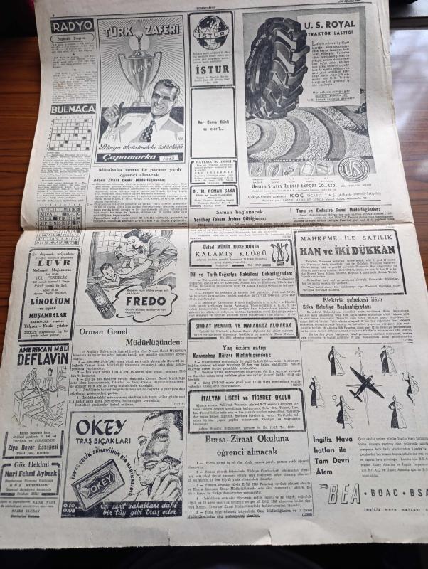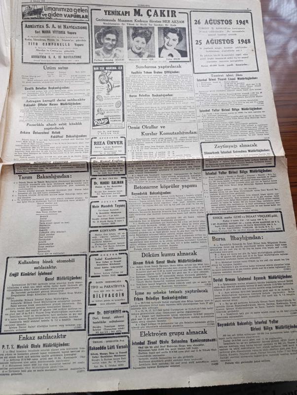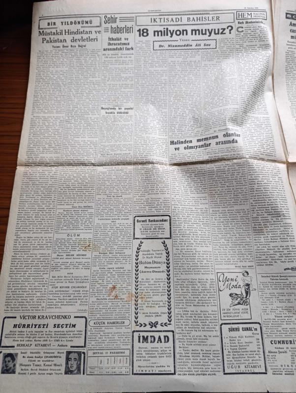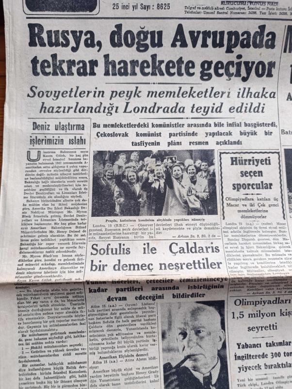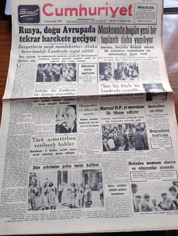 Cumhuriyet Gazetesi - 16 Ağustos 1948 - Deniz Ulaştırma İşlerimizin Islahı Yazan Abidin Daver Köşe Yazısı - Rusya Doğu Avrupa'da Tekrar Harekete Geçiyor - Pragda Kadınların Komünizm Aleyhinde Yaptıkları Nümayiş Fotoğraf - Moskova'da Bugün Yeni Bir Toplantı Daha Yapılıyor - Olimpiyatları 1,5 Milyon Kişi Seyretti - Yabancı Takımlar İngiltere'de 300 Ton Yiyecek Bıraktılar - Millet Partisi Fahri Başkanı Mareşal Fevzi Çakmak Demokrat Partiyi Muvazaa İle İtham Ediyor - Türk Armatörlere Verilecek Haklar - Demokrat Partililerin Yeni Mitingi - Röntgen Filmi Bollaşıyor - Müstakil Hindistan Ve Pakistan Devletleri Yazan Ömer Rıza Doğrul - Dar Yol Yazan Peride Celal Yazı Dizisi - 13 Sene Sonra Yazan Burhan Felek Köşe Yazısı - 1948 1949 Yunus Nadi Mükafatı Atatürk'e Ait Bir Hatıra - Perihan Altındağ Sözeri Müzeyyen Senar Işıl Ve Zehra Bilir Yenikapı M. Çakır Gazinosunda - Tarihten Meraklı Sahifeler Yazan Hamdi Varoğlu - Bugünkü Radyo Programı - Bulmaca - Çapamarka - U. S. Royal Traktör Lastiği adlı eser, Kitap > Süreli Yayınlar > Gazeteler > Türkiye > Genel > Günlük kategorisinde İkinci El olarak satıştadır.
