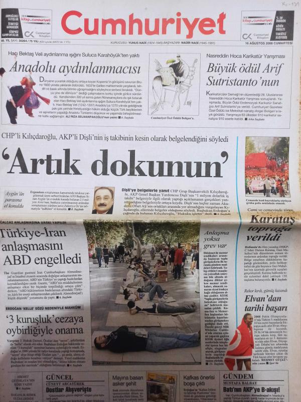 Cumhuriyet Gazetesi - 16 Ağustos 2008 - Şaban Dişli - Kemal Kılıçdaroğlu - Orhan Erinç - Mahmut Dikerdem - Ali Taygun - Hüseyin Baş - Reha İsvan - Nedim Tarhan - Uğur Kökden - Yıpranma, Sararma, Yırtılmalar Zamana Bağlı Olarak Görülebilir.