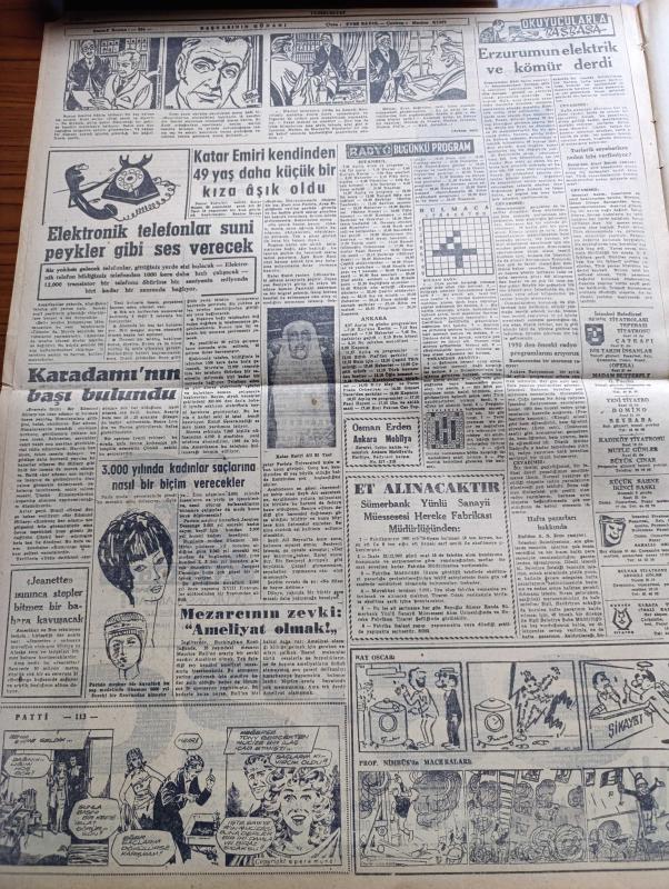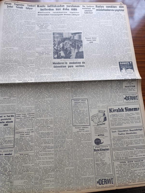 Cumhuriyet Gazetesi - 16 Aralık 1960 - Yanan Yugoslav Tankeri Peter Zoranoviç İstanbul'u Tehdit Ediyor - Amerikan Donanmasından Türk Hava Kuvvetlerinden Söndürme Malzemesi Geldi - Yanan Yunan Tankerinin Sahibi Meşhur Armatör Niarchos İstanbul'a Geldi - Personel Dairesi Kanunu Kabul Edildi - Erzurum Radyosu Neşriyata Başladı - Adnan Menderes'in Avukatına Da Örtülü Ödenek'ten Para Verilmiş - Hasan Polatkan'ın Avukatı Hüsamettin Cindoruk Dün Tevkif Edildi - Yakınları Düşükleri 50 Şer Kişilik Gruplar Halinde Ziyaret Edebilir - Tanker İnfilakının Resim Ve Hikayesi - 10. Köy Yazan Fakir Baykurt Yazı Dizisi - Atatürk'ün Tarihi Karyola Ve Masası Röportajı Yapan Sait Arif Terzioğlu - Sömürgecilik Konusu Bir Neticeye Bağlandı - Amerika Aya Yine Ulaşamadı - Burhan Felek Köşe Yazısı - Resimli Roman Başkasının Günahı Çizen Yves Sayol - Elektronik Telefonlar Suni Peykler Gibi Ses Verecek - Metin Oktay'ın Durumu Yarın Belli Olacak - Futbolcuların Lideri Jimmy Hill - Denizgücü Boks Birincisi Oldu, Yunus Nadi tarafından kaleme alınmıştır. Cumhuriyet Gazetesi - 16 Aralık 1960 - Yanan Yugoslav Tankeri Peter Zoranoviç İstanbul'u Tehdit Ediyor - Amerikan Donanmasından Türk Hava Kuvvetlerinden Söndürme Malzemesi Geldi - Yanan Yunan Tankerinin Sahibi Meşhur Armatör Niarchos İstanbul'a Geldi - Personel Dairesi Kanunu Kabul Edildi - Erzurum Radyosu Neşriyata Başladı - Adnan Menderes'in Avukatına Da Örtülü Ödenek'ten Para Verilmiş - Hasan Polatkan'ın Avukatı Hüsamettin Cindoruk Dün Tevkif Edildi - Yakınları Düşükleri 50 Şer Kişilik Gruplar Halinde Ziyaret Edebilir - Tanker İnfilakının Resim Ve Hikayesi - 10. Köy Yazan Fakir Baykurt Yazı Dizisi - Atatürk'ün Tarihi Karyola Ve Masası Röportajı Yapan Sait Arif Terzioğlu - Sömürgecilik Konusu Bir Neticeye Bağlandı - Amerika Aya Yine Ulaşamadı - Burhan Felek Köşe Yazısı - Resimli Roman Başkasının Günahı Çizen Yves Sayol - Elektronik Telefonlar Suni Peykler Gibi Ses Verecek - Metin Oktay'ın Durumu Yarın Belli Olacak - Futbolcuların Lideri Jimmy Hill - Denizgücü Boks Birincisi Oldu adlı eser Türkçe dilindedir.
