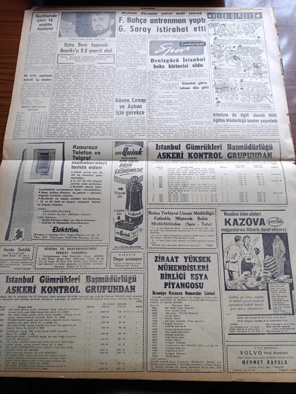 Cumhuriyet Gazetesi - 16 Aralık 1960 - Yanan Yugoslav Tankeri Peter Zoranoviç İstanbul'u Tehdit Ediyor - Amerikan Donanmasından Türk Hava Kuvvetlerinden Söndürme Malzemesi Geldi - Yanan Yunan Tankerinin Sahibi Meşhur Armatör Niarchos İstanbul'a Geldi - Personel Dairesi Kanunu Kabul Edildi - Erzurum Radyosu Neşriyata Başladı - Adnan Menderes'in Avukatına Da Örtülü Ödenek'ten Para Verilmiş - Hasan Polatkan'ın Avukatı Hüsamettin Cindoruk Dün Tevkif Edildi - Yakınları Düşükleri 50 Şer Kişilik Gruplar Halinde Ziyaret Edebilir - Tanker İnfilakının Resim Ve Hikayesi - 10. Köy Yazan Fakir Baykurt Yazı Dizisi - Atatürk'ün Tarihi Karyola Ve Masası Röportajı Yapan Sait Arif Terzioğlu - Sömürgecilik Konusu Bir Neticeye Bağlandı - Amerika Aya Yine Ulaşamadı - Burhan Felek Köşe Yazısı - Resimli Roman Başkasının Günahı Çizen Yves Sayol - Elektronik Telefonlar Suni Peykler Gibi Ses Verecek - Metin Oktay'ın Durumu Yarın Belli Olacak - Futbolcuların Lideri Jimmy Hill - Denizgücü Boks Birincisi Oldu adlı eser, Kitap > Süreli Yayınlar > Gazeteler > Türkiye > Genel > Günlük kategorisinde İkinci El olarak satıştadır.