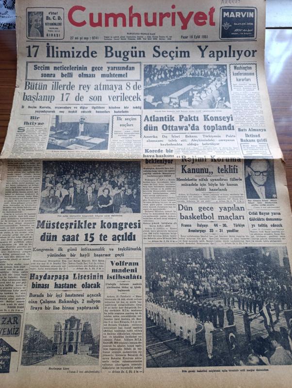 Cumhuriyet Gazetesi - 16 Eylül 1951 - Bir İhtiyaç Yazan Nadir Nadi Köşe Yazısı - 17 İlimizde Bugün Seçim Yapılıyor - Bütün İllerde Rey Atmaya 8 De Başlanıp 17 De Son Verilecek - İlk Seçim Suçları - Müsteşrikler Kongresi Dün Saat 15 te Açıldı - Haydarpaşa Lisesinin Binası Hastane Olacak - Atlantik Paktı Konseyi Dün Ottowa'da Toplandı - Batı Almanya İktisat Bakanı Erhard Geldi - Dün Gece Yapılan Basketbol Maçları - Fransa İtalyayı 44 30 Yendi - Türkiye Avusturyayı 33 31 Yendiler - Haftanın Şakaları Yazan Burhan Felek - O İki Cadde Yazan Falih Rıfkı Atay - Bu Sene Bütün Kurbanlar Satıldı - Rüyalar Evi Yazan Peride Celal Yazı Dizisi - Romanya'daki Türk Azınlığı Tehcir Ediliyor - Arab Birliği Ve Türkiye - Komünistlik Propagandası Yapan Rupen Girgeç Yakalandı - Charlie Chaplin'in Eski Yatı İstanbula Geldi - Robinson Trupin Üçüncü Karşılaşmalarına Hazırlık - Beşiktaş Enosis'le Fenerbahçe Dörtler Muhteliti İle Karşılaşacaklar - Venedik Tenis Turnuvası - İsveç'te Bisiklet Yarışı - Sabite Tur adlı eser, Kitap > Süreli Yayınlar > Gazeteler > Türkiye > Genel > Günlük kategorisinde İkinci El olarak satıştadır.