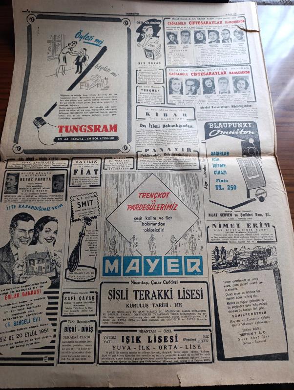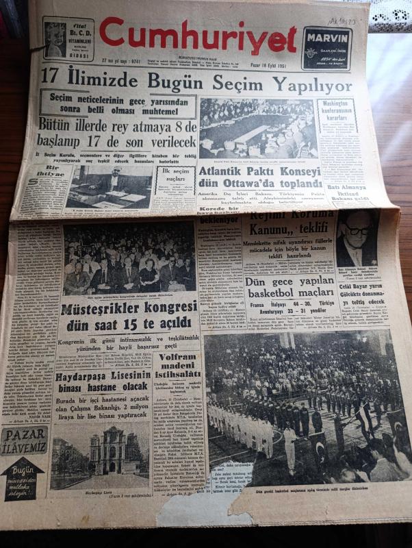 Cumhuriyet Gazetesi - 16 Eylül 1951 - Bir İhtiyaç Yazan Nadir Nadi Köşe Yazısı - 17 İlimizde Bugün Seçim Yapılıyor - Bütün İllerde Rey Atmaya 8 De Başlanıp 17 De Son Verilecek - İlk Seçim Suçları - Müsteşrikler Kongresi Dün Saat 15 te Açıldı fotoğraf - Haydarpaşa Lisesinin Binası Hastane Olacak - Atlantik Paktı Konseyi Dün Ottowa'da Toplandı fotoğraf - Batı Almanya İktisat Bakanı Erhard Geldi - Dün Gece Yapılan Basketbol Maçlarının açılış töreni fotoğraf - Türkiye Avusturyayı 33 31 Yendiler - Haftanın Şakaları Yazan Burhan Felek - O İki Cadde Yazan Falih Rıfkı Atay - Rüyalar Evi Yazan Peride Celal Yazı Dizisi - Romanya'daki Türk Azınlığı Tehcir Ediliyor - Arab Birliği Ve Türkiye - Komünistlik Propagandası Yapan Rupen Girgeç Yakalandı - Charlie Chaplin'in Eski Yatı İstanbula Geldi - Beşiktaş Enosis'le Fenerbahçe Dörtler Muhteliti İle Karşılaşacaklar - Venedik Tenis Turnuvası - Sabite Tur Perihan Sözeri Abdullah Yüce Hamiyet Yüceses Cağaloğlu çiftesaraylar bahçesinde adlı eser, Kitap > Süreli Yayınlar > Gazeteler > Türkiye > Genel > Günlük kategorisinde İkinci El olarak satıştadır.