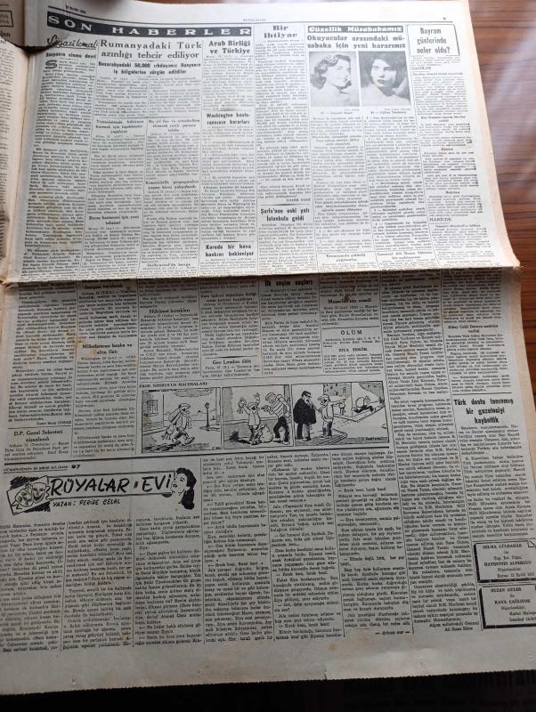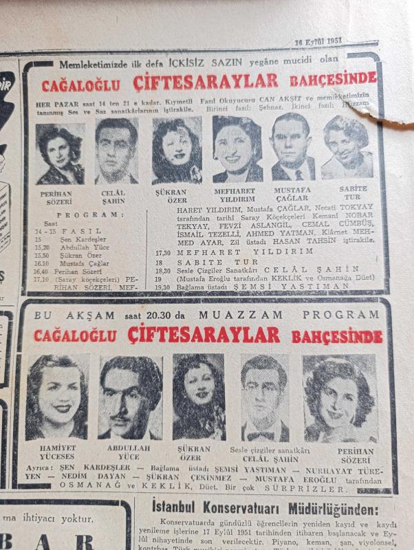 Cumhuriyet Gazetesi - 16 Eylül 1951 - Bir İhtiyaç Yazan Nadir Nadi Köşe Yazısı - 17 İlimizde Bugün Seçim Yapılıyor - Bütün İllerde Rey Atmaya 8 De Başlanıp 17 De Son Verilecek - İlk Seçim Suçları - Müsteşrikler Kongresi Dün Saat 15 te Açıldı fotoğraf - Haydarpaşa Lisesinin Binası Hastane Olacak - Atlantik Paktı Konseyi Dün Ottowa'da Toplandı fotoğraf - Batı Almanya İktisat Bakanı Erhard Geldi - Dün Gece Yapılan Basketbol Maçlarının açılış töreni fotoğraf - Türkiye Avusturyayı 33 31 Yendiler - Haftanın Şakaları Yazan Burhan Felek - O İki Cadde Yazan Falih Rıfkı Atay - Rüyalar Evi Yazan Peride Celal Yazı Dizisi - Romanya'daki Türk Azınlığı Tehcir Ediliyor - Arab Birliği Ve Türkiye - Komünistlik Propagandası Yapan Rupen Girgeç Yakalandı - Charlie Chaplin'in Eski Yatı İstanbula Geldi - Beşiktaş Enosis'le Fenerbahçe Dörtler Muhteliti İle Karşılaşacaklar - Venedik Tenis Turnuvası - Sabite Tur Perihan Sözeri Abdullah Yüce Hamiyet Yüceses Cağaloğlu çiftesaraylar bahçesinde, Yunus Nadi tarafından kaleme alınmıştır. Cumhuriyet Gazetesi - 16 Eylül 1951 - Bir İhtiyaç Yazan Nadir Nadi Köşe Yazısı - 17 İlimizde Bugün Seçim Yapılıyor - Bütün İllerde Rey Atmaya 8 De Başlanıp 17 De Son Verilecek - İlk Seçim Suçları - Müsteşrikler Kongresi Dün Saat 15 te Açıldı fotoğraf - Haydarpaşa Lisesinin Binası Hastane Olacak - Atlantik Paktı Konseyi Dün Ottowa'da Toplandı fotoğraf - Batı Almanya İktisat Bakanı Erhard Geldi - Dün Gece Yapılan Basketbol Maçlarının açılış töreni fotoğraf - Türkiye Avusturyayı 33 31 Yendiler - Haftanın Şakaları Yazan Burhan Felek - O İki Cadde Yazan Falih Rıfkı Atay - Rüyalar Evi Yazan Peride Celal Yazı Dizisi - Romanya'daki Türk Azınlığı Tehcir Ediliyor - Arab Birliği Ve Türkiye - Komünistlik Propagandası Yapan Rupen Girgeç Yakalandı - Charlie Chaplin'in Eski Yatı İstanbula Geldi - Beşiktaş Enosis'le Fenerbahçe Dörtler Muhteliti İle Karşılaşacaklar - Venedik Tenis Turnuvası - Sabite Tur Perihan Sözeri Abdullah Yüce Hamiyet Yüceses Cağaloğlu çiftesaraylar bahçesinde adlı eser Türkçe dilindedir.