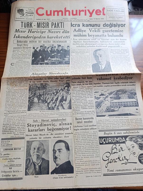 Cumhuriyet Gazetesi - 16 Haziran 1939 - Türk Mısır Paktı yazan Yunus Nadi Başmakale - icra kanunu değişiyor - Adliye Vekili Fethi Okyar gazetemize mühim beyanatta bulundu - Almanlar Slovakya'da büyük tahşidat yaptılar - Sırp Hırvat müzakereleri - Japonlar Tientsein'de İngiliz evlerinde taharriyat yaptılar - Mahfiruz Sultan Yazan Kadircan Kaflı Yazı Dizisi - Atatürk köprüsünün dubaları yerine kondu fotoğraf - uzakşark hadiseleri yazan Muharrem Fevzi Togay - Türkkuşu filosu Bursa'dan İzmir'e hareket etti - telefon mucidi Graham bell'in hayatı sinemaya alındı fotoğraf - Bu akşamki radyo programı - 23 Temmuz 1939 Türk günü bütün Amerika bugünü kutlamaya hazırlanıyor - Londra'dan mektup yazan Abidin Daver - Turgutlu mekteplerinde Kızılay teşkilatı fotoğraf - istişare heyeti Dolmabahçe Stadyumu planını tetkik ediyor fotoğraf - Galatasaray Beşiktaş'la yeniden karşılaşacak - uçurumda bir genç kız yazan Server Bedi yazı dizisi - boksör küçük Kemal Dün vefat etti - Eminönü'ndeki yeni saat Foto, Yunus Nadi tarafından kaleme alınmıştır. Cumhuriyet Gazetesi - 16 Haziran 1939 - Türk Mısır Paktı yazan Yunus Nadi Başmakale - icra kanunu değişiyor - Adliye Vekili Fethi Okyar gazetemize mühim beyanatta bulundu - Almanlar Slovakya'da büyük tahşidat yaptılar - Sırp Hırvat müzakereleri - Japonlar Tientsein'de İngiliz evlerinde taharriyat yaptılar - Mahfiruz Sultan Yazan Kadircan Kaflı Yazı Dizisi - Atatürk köprüsünün dubaları yerine kondu fotoğraf - uzakşark hadiseleri yazan Muharrem Fevzi Togay - Türkkuşu filosu Bursa'dan İzmir'e hareket etti - telefon mucidi Graham bell'in hayatı sinemaya alındı fotoğraf - Bu akşamki radyo programı - 23 Temmuz 1939 Türk günü bütün Amerika bugünü kutlamaya hazırlanıyor - Londra'dan mektup yazan Abidin Daver - Turgutlu mekteplerinde Kızılay teşkilatı fotoğraf - istişare heyeti Dolmabahçe Stadyumu planını tetkik ediyor fotoğraf - Galatasaray Beşiktaş'la yeniden karşılaşacak - uçurumda bir genç kız yazan Server Bedi yazı dizisi - boksör küçük Kemal Dün vefat etti - Eminönü'ndeki yeni saat Foto adlı eser Türkçe dilindedir.