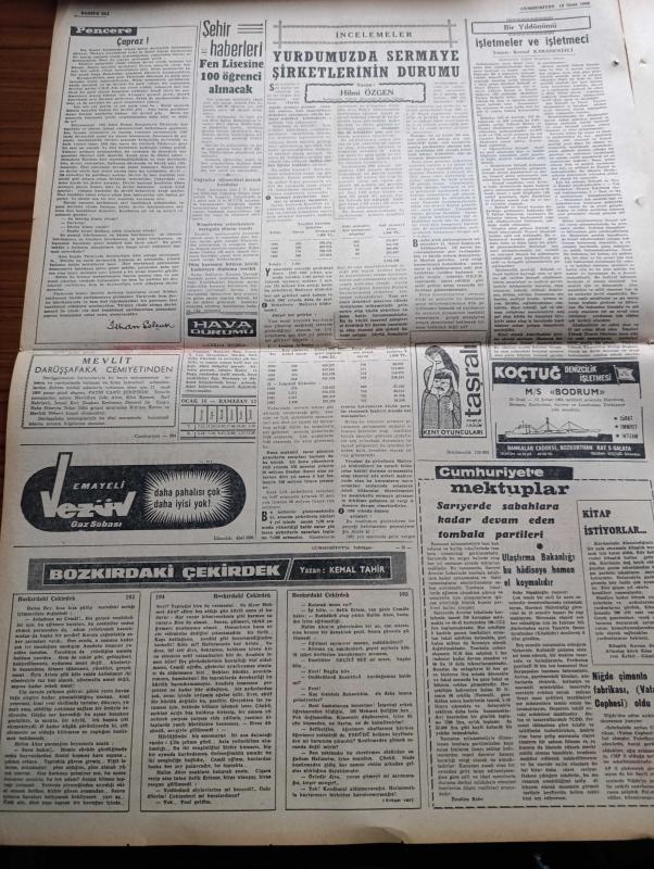 Cumhuriyet Gazetesi - 16 Ocak 1965 - Adalet Partisi Küçük Partilere Karşı - Winston Churchill Hasta - Sahte Diploma Yolsuzluğunun 35 Sanığı Ağır Cezaya Verildi - Ankara'da Babeuf Davasına Başlandı - İlhan Selçuk Köşe Yazısı - Bozkırdaki Çekirdek Yazan Kemal Tahir Yazı Dizisi - Burhan Felek Köşe Yazısı - Kennedy'nin Bir Mektubu 27.000 Liraya Satıldı - Malkoçoğlu Konu Ve Resim Ayhan Başoğlu - James Bond Çizgi Roman - Dehşet Yolu Yazan Richard M. Stern Yazı - Milli Takım Adayları 2. Antreman Maçını Bugün Ali Sami Yen Stadında Galatasaray Genç Takımı İle Yapıyor - Metin Oktay İstirahatte - Puppo Sandro Gerçek Bir Futbol Adamıdır - Yaşar Doğu Kupası Güreşleri Sona Erdi, Yunus Nadi tarafından kaleme alınmıştır. Cumhuriyet Gazetesi - 16 Ocak 1965 - Adalet Partisi Küçük Partilere Karşı - Winston Churchill Hasta - Sahte Diploma Yolsuzluğunun 35 Sanığı Ağır Cezaya Verildi - Ankara'da Babeuf Davasına Başlandı - İlhan Selçuk Köşe Yazısı - Bozkırdaki Çekirdek Yazan Kemal Tahir Yazı Dizisi - Burhan Felek Köşe Yazısı - Kennedy'nin Bir Mektubu 27.000 Liraya Satıldı - Malkoçoğlu Konu Ve Resim Ayhan Başoğlu - James Bond Çizgi Roman - Dehşet Yolu Yazan Richard M. Stern Yazı - Milli Takım Adayları 2. Antreman Maçını Bugün Ali Sami Yen Stadında Galatasaray Genç Takımı İle Yapıyor - Metin Oktay İstirahatte - Puppo Sandro Gerçek Bir Futbol Adamıdır - Yaşar Doğu Kupası Güreşleri Sona Erdi adlı eser Türkçe dilindedir.