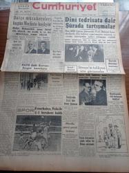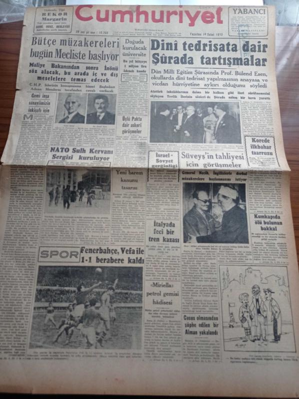 Cumhuriyet Gazetesi - 16 Şubat 1953 - Dini Tedrisata Dair Milli Eğitim Şurasında Tartışmalar - Bütçe Müzakereleri Bugün Mecliste Başlıyor - NATO Sulh Kervanı Sergisi Kuruluyor - Yeni Barem Kanunu Tasarısı - Fenerbahçe Vefa İle 1 1 Berabere Kaldı - İsrail Sovyet Gerginliği - Kore'de İlkbahar Taarruzu - Süveyş'in Tahliyesi İçin Görüşmeler- 3 Kadının Romanı Yazan Peride Celal Yazı Dizisi - Atlantikte Yelkenle 6000 Mil Yazan Sadun Boro Yazı Dizisi - Hüsnü Sadık Durukal - Eski Maliye Bakanı Halil Ayan Vefat Etti- Sabık Kral Faruğun Hayatı Filme Alınıyor - Doğubank - Cennet Yolu Yazan Steinbeck Yazı Dizisi - Şimal Buz Devri Diyarlarının Devesi Ren Geyiği - Kadınlar Celladı Landru Yazı Dizisi - Fransız Rejisörlerine Göre Türk Sahnesi - Vog Bali Çorapları - Nefis Arı Bisküvileri - Star Radyoları - Kuzuluk Maden Suyu Ve Sodaları adlı eser, Kitap > Süreli Yayınlar > Gazeteler > Türkiye > Genel > Günlük kategorisinde İkinci El olarak satıştadır.