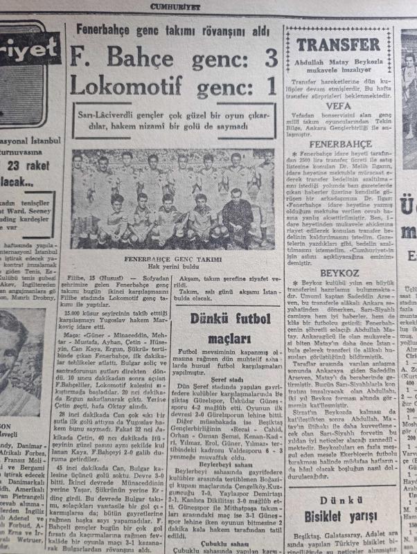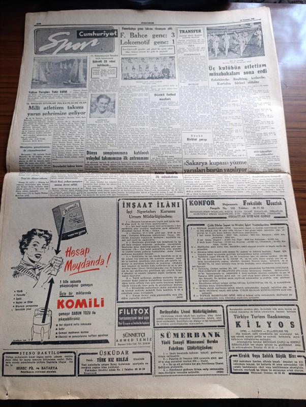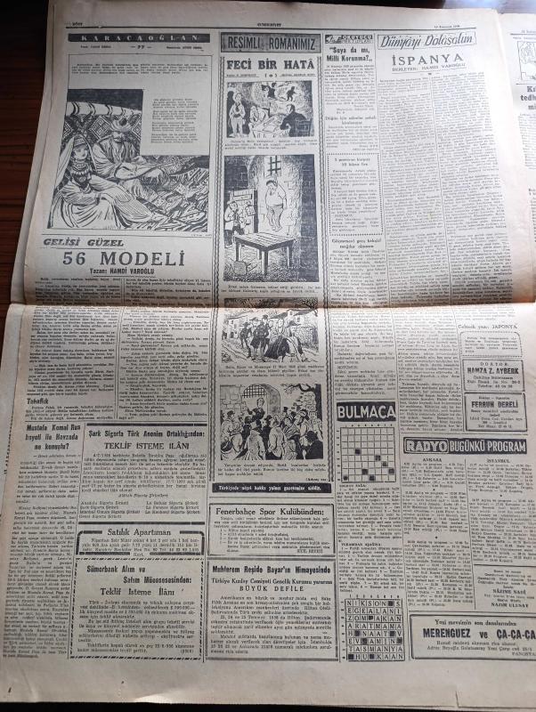 Cumhuriyet Gazetesi - 16 Temmuz 1956 - Dost Pakistan Devlet Reisi İskender Mirza Hararetle Karşılandı fotoğraf - Büyük Millet Meclisi Bugün Yaz Tatiline Başlıyor - Nixon Başkan Eisenhower'e İzahat Verdi - 6. Kore Tugayımız Dönüyor - Işık Lisesinde Dün Sabah Yangın Çıktı fotoğraf - Rüyam Kotrasının Sahibi Haşim Mardini Yarışı Anlatıyor - Define Arayıcıları Çoğalıyor - Trenlerde Telefon - Karanlıkta Sesler Yazan Perihan Zorlu Yazı Dizisi - Mustafa Kemal Rus Heyeti İle Havzada Ne Konuştu - Karamürsel Araba Vapurunun Tecrübeleri - İsviçre'de Başaşağı Otel İnşa Edildi - İzmir Fuarı Hazırlıkları - Stalin'in Gizli Cinayetleri - Emekli Orgeneral Cemil Cahid Toydemir'in Cenazesi Kaldırıldı - Boston Senfoni Orkestrası Avrupa'da Turneye Çıkıyor - Karacaoğlan Yazan Yaşar Kemal Resimleyen Münif Fehim Yazı Dizisi - Sarışın Bomba Marilyn Monroe Lady Macbeht'i Oynamak İstiyor fotoğraf - Atletizmde Erkeklerde Beşiktaş Kızlarda Kurtuluş Birinci Oldu - 11. Enternasyonal İstanbul Tenis Turnuvası, Yunus Nadi tarafından kaleme alınmıştır. Cumhuriyet Gazetesi - 16 Temmuz 1956 - Dost Pakistan Devlet Reisi İskender Mirza Hararetle Karşılandı fotoğraf - Büyük Millet Meclisi Bugün Yaz Tatiline Başlıyor - Nixon Başkan Eisenhower'e İzahat Verdi - 6. Kore Tugayımız Dönüyor - Işık Lisesinde Dün Sabah Yangın Çıktı fotoğraf - Rüyam Kotrasının Sahibi Haşim Mardini Yarışı Anlatıyor - Define Arayıcıları Çoğalıyor - Trenlerde Telefon - Karanlıkta Sesler Yazan Perihan Zorlu Yazı Dizisi - Mustafa Kemal Rus Heyeti İle Havzada Ne Konuştu - Karamürsel Araba Vapurunun Tecrübeleri - İsviçre'de Başaşağı Otel İnşa Edildi - İzmir Fuarı Hazırlıkları - Stalin'in Gizli Cinayetleri - Emekli Orgeneral Cemil Cahid Toydemir'in Cenazesi Kaldırıldı - Boston Senfoni Orkestrası Avrupa'da Turneye Çıkıyor - Karacaoğlan Yazan Yaşar Kemal Resimleyen Münif Fehim Yazı Dizisi - Sarışın Bomba Marilyn Monroe Lady Macbeht'i Oynamak İstiyor fotoğraf - Atletizmde Erkeklerde Beşiktaş Kızlarda Kurtuluş Birinci Oldu - 11. Enternasyonal İstanbul Tenis Turnuvası adlı eser Türkçe dilindedir.