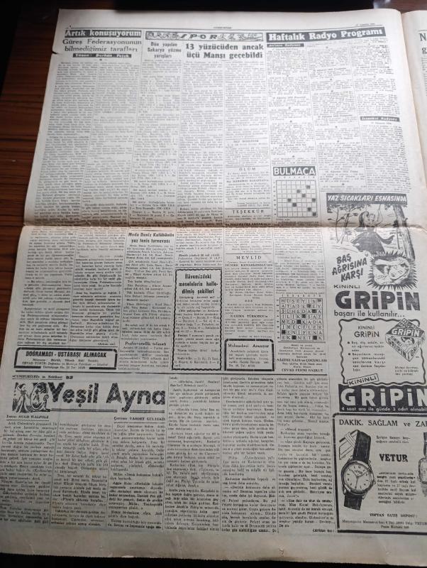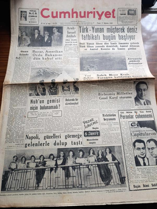 Cumhuriyet Gazetesi - 17 Ağustos 1952 - Onun İzinde Yazan Nadir Nadi Köşe Yazısı - Celal Bayar Amerikan Ordu Bakanı Frank Pace'i Kabul Etti Fotoğraf - Adnan Menderes - Arap İsrail İhtilafı - Nuh'un Gemisi Niçin Bulunamadı Yaşar Kemal Bildiriyor - Kıymetli Sanatkarımız Nurullah Şevket Taşkıran'ı Kaybettik - Sabık Mısır Kralı Faruğun Halifeliği - Üniversite Rektörü Kazım İsmail Gürkan'ın Beyanatı - Müsabakaya Girecek Güzellerin Napoli'de Çekilen İlk Resimleri - Hamiyet Yüceses Ve İsmail Dümbüllü Beşiktaş Bahçesinde - Bankacılar Sendika Kuruyor - Kara Çarşaf Ve Şeffaf Mayo Yazan Doçent Doktor Nurullah Kunter - Peron'lar Cehennemi Yazan Doktor Alberto Caride Yazı Dizisi - Ruh Gurbetinde Yazan Kerime Nadir Yazı Dizisi - 175 İlim Adamı Ankara Vapuruyla İstanbula Geliyor - Güreş Federasyonunun Bilmediğimiz Tarafları Yazan Burhan Felek Köşe - Moda Deniz Kulübünün Yaz Tenis Turnuvası - Haftalık Radyo Programı - Müzeyyen Senar Hacer Buluş Saime Sinan Abdullah Yüce Ferdi Tayfur Ve Sabite Tur Foto adlı eser, Kitap > Süreli Yayınlar > Gazeteler > Türkiye > Genel > Günlük kategorisinde İkinci El olarak satıştadır.