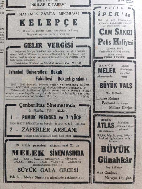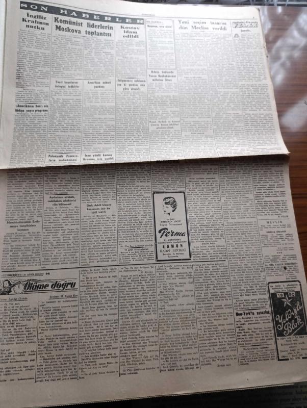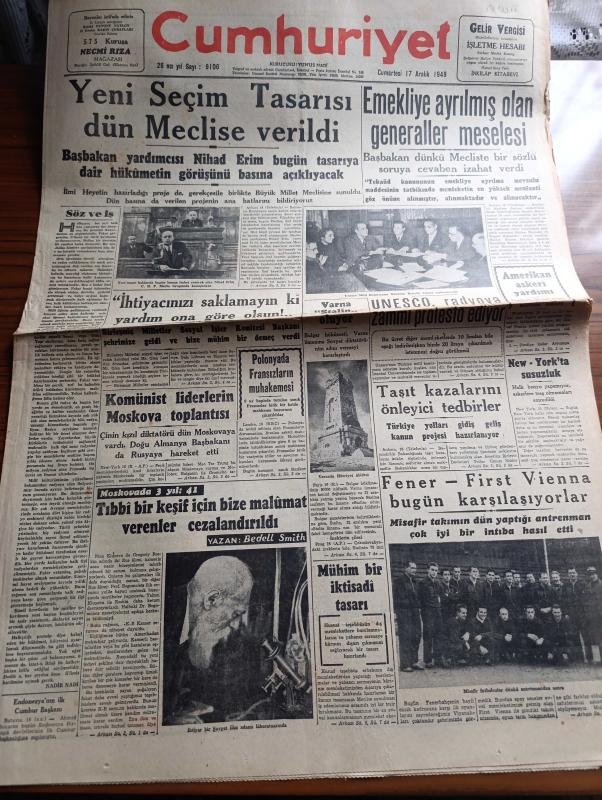 Cumhuriyet Gazetesi - 17 Aralık 1949 - söz ve iş yazan Nadir Nadi Başmakale - yeni seçim tasarısı Dün meclise verildi - Başbakan yardımcısı niyetim bugün tasarıya dair hükümetin görüşünü basına açıklayacak - emekliye ayrılmış olan generaller meselesi - Varna Stalin oluyor - komünist liderlerin Moskova toplantısı - Fenerbahçe First Vienna bugün karşılaşıyorlar fotoğraf - Moskova'da 3 yıl yazan Bedell Smith yazı dizisi - kitaplar arasında yazan A. Adnan Adıvar - haftalık zabıta mecmuası kelepçe - çam sakızı filmi dublaj rejisini idare eden Ferdi Tayfur Bugün İpek sinemasında - Amerika'nın sesinin Türkçe yayın programı - şamata yazan Burhan Felek - Bulgaristan eski başbakan muavini Kostov idam edildi - Turgut Reis yazan Halikarnas balıkçısı yazı dizisi - UNESCO radyoya zammı protesto ediyor - erkek liseleri arasındaki futbol maçları - Türkiye Garanti Bankası - Taksim Rumelihisarı arası otobüs meselesi - İstanbul Ankara radyo programı - RCA Radyo - odeon mağazaları - Necipbey kolonyaları, Yunus Nadi tarafından kaleme alınmıştır. Cumhuriyet Gazetesi - 17 Aralık 1949 - söz ve iş yazan Nadir Nadi Başmakale - yeni seçim tasarısı Dün meclise verildi - Başbakan yardımcısı niyetim bugün tasarıya dair hükümetin görüşünü basına açıklayacak - emekliye ayrılmış olan generaller meselesi - Varna Stalin oluyor - komünist liderlerin Moskova toplantısı - Fenerbahçe First Vienna bugün karşılaşıyorlar fotoğraf - Moskova'da 3 yıl yazan Bedell Smith yazı dizisi - kitaplar arasında yazan A. Adnan Adıvar - haftalık zabıta mecmuası kelepçe - çam sakızı filmi dublaj rejisini idare eden Ferdi Tayfur Bugün İpek sinemasında - Amerika'nın sesinin Türkçe yayın programı - şamata yazan Burhan Felek - Bulgaristan eski başbakan muavini Kostov idam edildi - Turgut Reis yazan Halikarnas balıkçısı yazı dizisi - UNESCO radyoya zammı protesto ediyor - erkek liseleri arasındaki futbol maçları - Türkiye Garanti Bankası - Taksim Rumelihisarı arası otobüs meselesi - İstanbul Ankara radyo programı - RCA Radyo - odeon mağazaları - Necipbey kolonyaları adlı eser Türkçe dilindedir.