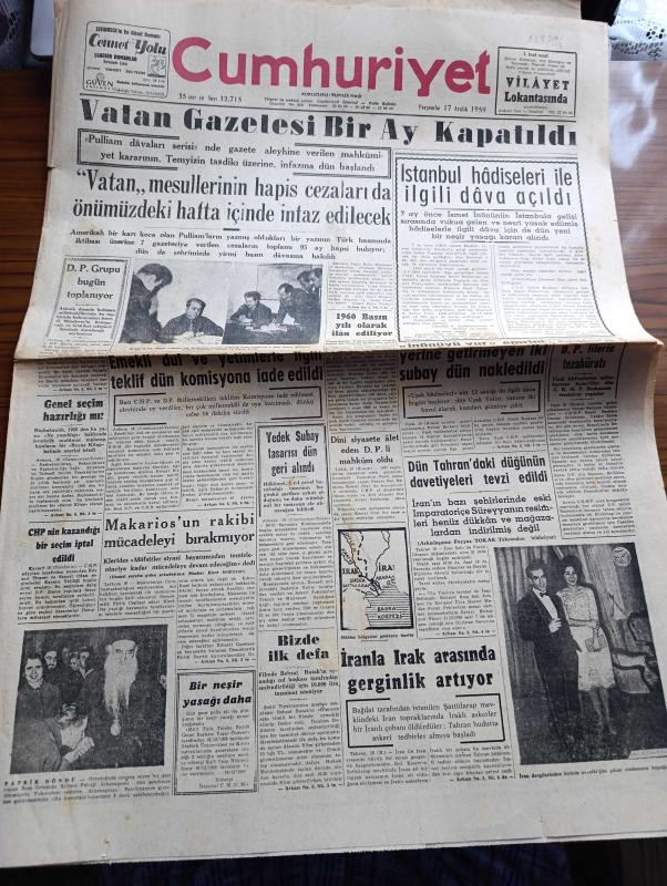 Cumhuriyet Gazetesi - 17 Aralık 1959 - Vatan Gazetesi Bir Ay Kapatıldı - Pulliam Davaları Serisi - 16 şar Hapis Cezaları Temyizce Tasdik Edilmiş Olan Selami Akpınar Ve Naim Tirali Fotoğraf - İstanbul Hadiseleri İle İlgili Dava Açıldı - 1960 Basın Yılı İlan Ediliyor - İsmet İnönü'yü Vur Emrini Yerine Getirmeyen İki Subay Nakledildi - Dün Tahran'daki İran Şahı'nın Düğünü Davetiyeleri Tevzi Edildi - İran Dergilerinden Evvelki Gün Çıkan Nüshasının Kapağı Fotoğrafı - Rum Ortodoks Kilisesi Patriği Athenagoras Döndü Fotoğraf - Makarios'un Rakibi Mücadeleyi Bırakmıyor - Yılbaşı Gecesi Kontrolleri - Refah Ne Demektir Yazan Burhan Felek Köşe Yazısı - Koruyucu Melekler Çizgi Roman - Ankara İstanbul Radyosu Programı - Fenerbahçe mi Galatasaray Mı - Fenerbahçe Galatasaray Maçının Hakemi Orhan Gönül - Galatasaray Takımından Haberler - Fenerbahçe Takımından Haberler adlı eser, Kitap > Süreli Yayınlar > Gazeteler > Türkiye > Genel > Günlük kategorisinde İkinci El olarak satıştadır.