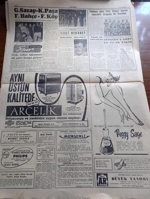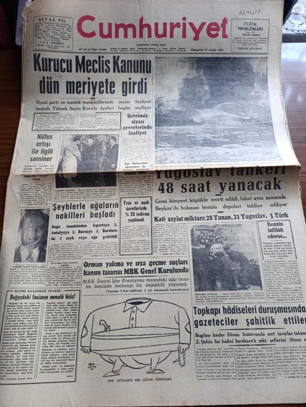 Cumhuriyet Gazetesi - 17 Aralık 1960 - Kurucu Meclis Kanunu Dün Meriyete Girdi - Nüfus Artışı İle İlgili Seminer - Şeyhlerle Ağaların Nakilleri Başladı - Yugoslav Peter Zaroviç Tankeri 48 Saat Yanacak fotoğraf - Topkapı Hadiseleri Duruşmasında Gazeteciler Şahitlik Ettiler - Ege Üniversitesi Öğrencileri De Cezayir Olaylarını Protesto Ettiler - Orman Yakma Ve Irza Geçme Suçları Kanun Tasarısı Milli Birlik Komitesi Genel Kurulunda - 10. Köy Yazan Fakir Baykurt Yazı Dizisi - Atatürk'ün Akaretlerde Oturduğu Ev - İsrail'de Nükleer Bomba Yapacak Duruma Gelmiş - Apikoğlu Sucuk - Ünlü Opera Sanatçısı Maria Callas fotoğraf - 1959 1960 Yunus Nadi Armağanı Dil Davamız İkinci Büyük Atılım Yazan Cemal Gürlek - 1958 Dünya Kupasını Kazanan Takım Brezilya Fotoğraf - Gündüz Kılıç'ın Unutamadığı An - Jeppson'a Göre En İyi 10 Takım - Atletico Madrid Garincha'ya 1,5 Milyon Veriyor - Fenerbahçe Feriköy Maçı - Galatasaray Kasımpaşa Maçı - galatasaraylılar dün yaptıkları son antrenmanda -Arçelik gaz sobası adlı eser, Kitap > Süreli Yayınlar > Gazeteler > Türkiye > Genel > Günlük kategorisinde İkinci El olarak satıştadır.