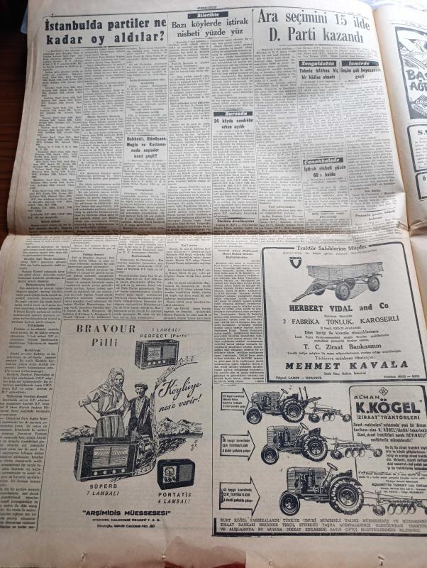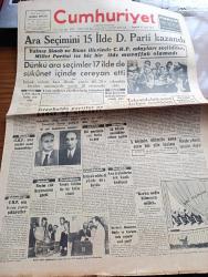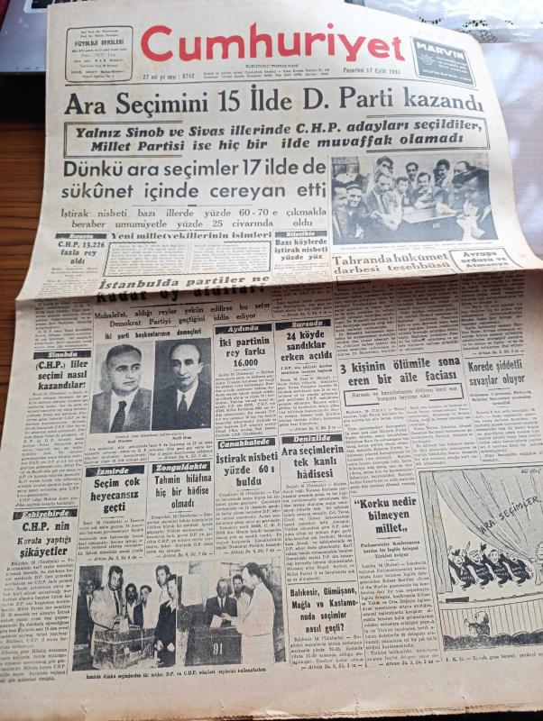 Cumhuriyet Gazetesi - 17 Eylül 1951 - Ara Seçimini 15 İlde Demokrat Parti Kazandı - Dünkü Ara Seçimler 17 İlde De Sükunet İçinde Cereyan Etti - Sinop'ta CHP'liler Nasıl Kazandılar - Sivas'ta CHP 13,226 Fazla Rey Aldı - İstanbul'da Partiler Ne Kadar Oy Aldılar - Denizli'de Ara Seçimlerin Tek Kanlı Hadisesi - İstanbul'un Yeni Demokrat Milletvekilleri Hadi Hüsmen Ve Seyfi Oran - Bursa'da 24 Köyde Sandıklar Erken Açıldı - Çanakkale'de İştirak Nisbeti Yüzde 60 ı Buldu - Bir Amerikalı Gazetecinin Türkiye İntibaları 2 Yazan Ray Brock - Tahran'da Hükümet Darbesi Teşebbüsü - Avrupa Ordusu Ve Almanya - Kore'de Şiddetli Savaşlar Oluyor - General Franco İle Mülakat - Rüyalar Evi Yazan Peride Celal Yazı Dizisi - İsrail'de Yiyecek Sıkıntısı Başgösterdi - Beşiktaş Enosis'i 2 1 Mağlup Etti - Fenerbahçe Dörtler Karmasını 4 0 Mağlup Etti - Kadın Gazeteci Lil'in Maceraları Çizgi Roman - Yelkenle İstanbul'dan Filipinlere Yazan Sinan Everest Yazı Dizisi - 1951 1952 Yunus Nadi Mükafatı En Güzel Şiir adlı eser, Kitap > Süreli Yayınlar > Gazeteler > Türkiye > Genel > Günlük kategorisinde İkinci El olarak satıştadır.