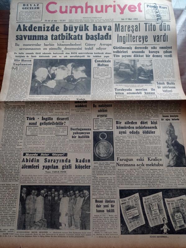 Cumhuriyet Gazetesi - 17 Mart 1953 - Mareşal Tito Dün İngiltere'ye Vardı - Çanakkale Haftası - Tarabyada Mucize İle Biten Otomobil Kazası - İnsana Benzeyen Bir Ağaç Bulundu - Faruğun Eski Kraliçe Neriman'a açık Mektubu - New Moon Tatbikatı - Mısır'da Neler Oluyor - Nadir Nadi - Esad Tekeli - Hüsnü Sadık Durukal - 3 Kadın Romanı Yazan Peride Celal Yazı Dizisi - Burhan Felek - 16. Milletlerarası Santranç Turnuvası - İstanbul Golf Kulübü - Ordulararası Futbol Karşılaşmaları - Türkiye'nin En Meşhur Kadın Casusu Yazı Dizisi - Geçmişte Büyük Cinayetler Yazı Dizisi - Radyolin Diş Macunu - Hikaye Artistler Kapısı - Philips Radyo - Çapamarka - Tokat Çoban Sucuğu - Varta Akümülatörü - Blaupunkt Radyo, Yunus Nadi tarafından kaleme alınmıştır. Cumhuriyet Gazetesi - 17 Mart 1953 - Mareşal Tito Dün İngiltere'ye Vardı - Çanakkale Haftası - Tarabyada Mucize İle Biten Otomobil Kazası - İnsana Benzeyen Bir Ağaç Bulundu - Faruğun Eski Kraliçe Neriman'a açık Mektubu - New Moon Tatbikatı - Mısır'da Neler Oluyor - Nadir Nadi - Esad Tekeli - Hüsnü Sadık Durukal - 3 Kadın Romanı Yazan Peride Celal Yazı Dizisi - Burhan Felek - 16. Milletlerarası Santranç Turnuvası - İstanbul Golf Kulübü - Ordulararası Futbol Karşılaşmaları - Türkiye'nin En Meşhur Kadın Casusu Yazı Dizisi - Geçmişte Büyük Cinayetler Yazı Dizisi - Radyolin Diş Macunu - Hikaye Artistler Kapısı - Philips Radyo - Çapamarka - Tokat Çoban Sucuğu - Varta Akümülatörü - Blaupunkt Radyo adlı eser Türkçe dilindedir.