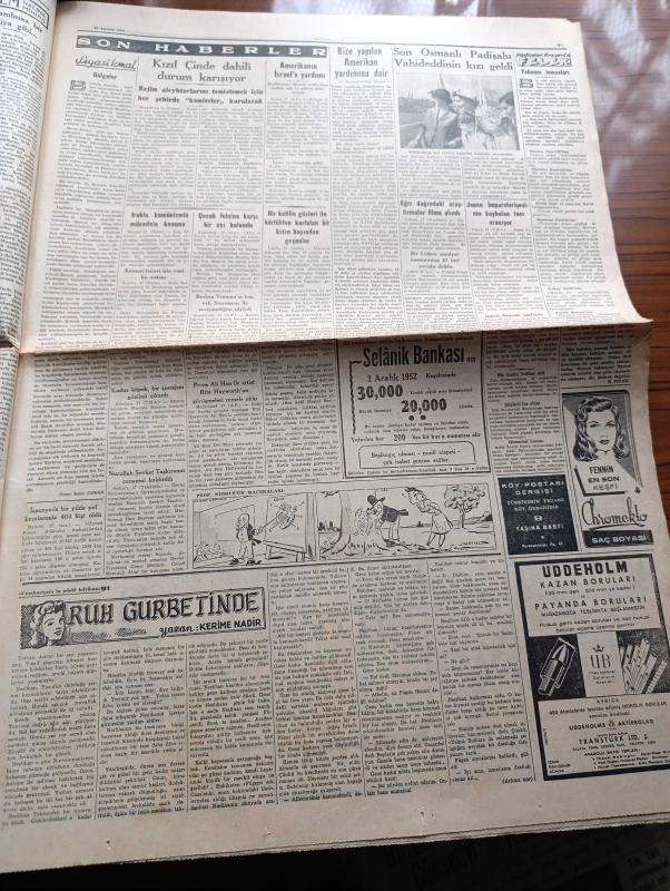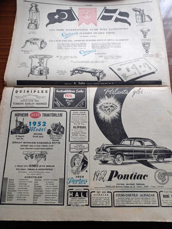 Cumhuriyet Gazetesi - 18 Ağustos 1952 - Türk Yunan Deniz Tatbikatı Başladı - Bize Yapılan Amerikan Yardımına Dair - 1952 Yılının 6 Ayında Yurdumuzda Taşıt Kazaları Yüzünden 440 Kişi Öldü - Celal Bayar İzmir Fuarının Açılışında Bulunacak - Vali Fahrettin Kerim Gökay Dün Gece Yugoslavyadan Geldi - Avrupa Güzelleri Napoli'de Halka Takdim Edildiler Fotoğraf - Ölümünün Yıldönümü Münasebetiyle Honore De Balzac Yazan Samih Nafiz Tansu - Kore'den Öğrencilere Mesaj - Peron'lar Cehennemi Yazan Doktor Alberto Caride Yazı Dizisi - Ruh Gurbetinde Yazan Kerime Nadir Yazı Dizisi - Son Osmanlı Padişahı Vahdeddin'in Kızı Ulviye Geldi Fotoğraf - Artık Konuşuyorum Yazan Burhan Felek Köşe Yazısı - Fenerbahçe Stadında Dünkü Spor Bayramı - Bugünkü Radyo Programı - İpana Diş Macunu - Günseli Başar Napoli'de Halka Takdim Edilirken Fotoğraf- Bendix Otomatik Çamaşır Kurutma Ve Ütü Makineleri - Avcılar Bayramı Dün Kutlandı - 1952 Pontiac Araba - Hofherr Traktörleri, Yunus Nadi tarafından kaleme alınmıştır. Cumhuriyet Gazetesi - 18 Ağustos 1952 - Türk Yunan Deniz Tatbikatı Başladı - Bize Yapılan Amerikan Yardımına Dair - 1952 Yılının 6 Ayında Yurdumuzda Taşıt Kazaları Yüzünden 440 Kişi Öldü - Celal Bayar İzmir Fuarının Açılışında Bulunacak - Vali Fahrettin Kerim Gökay Dün Gece Yugoslavyadan Geldi - Avrupa Güzelleri Napoli'de Halka Takdim Edildiler Fotoğraf - Ölümünün Yıldönümü Münasebetiyle Honore De Balzac Yazan Samih Nafiz Tansu - Kore'den Öğrencilere Mesaj - Peron'lar Cehennemi Yazan Doktor Alberto Caride Yazı Dizisi - Ruh Gurbetinde Yazan Kerime Nadir Yazı Dizisi - Son Osmanlı Padişahı Vahdeddin'in Kızı Ulviye Geldi Fotoğraf - Artık Konuşuyorum Yazan Burhan Felek Köşe Yazısı - Fenerbahçe Stadında Dünkü Spor Bayramı - Bugünkü Radyo Programı - İpana Diş Macunu - Günseli Başar Napoli'de Halka Takdim Edilirken Fotoğraf- Bendix Otomatik Çamaşır Kurutma Ve Ütü Makineleri - Avcılar Bayramı Dün Kutlandı - 1952 Pontiac Araba - Hofherr Traktörleri adlı eser Türkçe dilindedir.