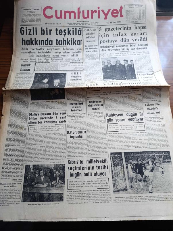 Cumhuriyet Gazetesi - 18 Aralık 1959 - Büyük Dikkat Yazan Nadir Nadi Köşe Yazısı - Gizli Bir Teşkilat Hakkında Tahkikat - 3 Gazeteci Ahmet Emin Yalman Selami Akpınar Ve Naim Tiralinin Hapsi İçin İnfaz Kararı Dün Postaya Verildi - Libya Kralı 3 Gazeteyi Kapattı - Uşak Hadisesinin Duruşması Başladı - Maliye Bakanı Hasan Polatkan Dün Yeni Bütçe Üzerinde 3 Saat Süren Bir Konuşma Yaptı - Fenerbahçe Galatasaray'ı Can Bartu'nun Golüyle Yendi Fotoğraf - Aşk Eceli Yendi Çeviren Hamdi Varoğlu Yazı Dizisi - Televizyon Skandalları Derleyen M. Kenan Kan - Mutlu Akü - Türkiye İş Bankası - Bir Bakkalın Marifeti Yazan Burhan Felek - İdil Biret Paris'te Konser Verdi - Ankara'da Kurulan Türkiye Matbuat Kulübü - Koruyucu Melekler Şatonun Kraliçesi - İnekler Ve Müzik - Bulmaca - İstanbul Şehir Tiyatroları Dram Kısmında Hamlet Oyunu - Fenerbahçe'nin Cenevre Kadrosu - Fenerbahçe Galatasaray Sezonun Maçından Enteresan Notlar - Naci Erdem Ve Metin Oktay Maçtan Bir Kare - Diko Elektrik Şofbenleri adlı eser, Kitap > Süreli Yayınlar > Gazeteler > Türkiye > Genel > Günlük kategorisinde İkinci El olarak satıştadır.