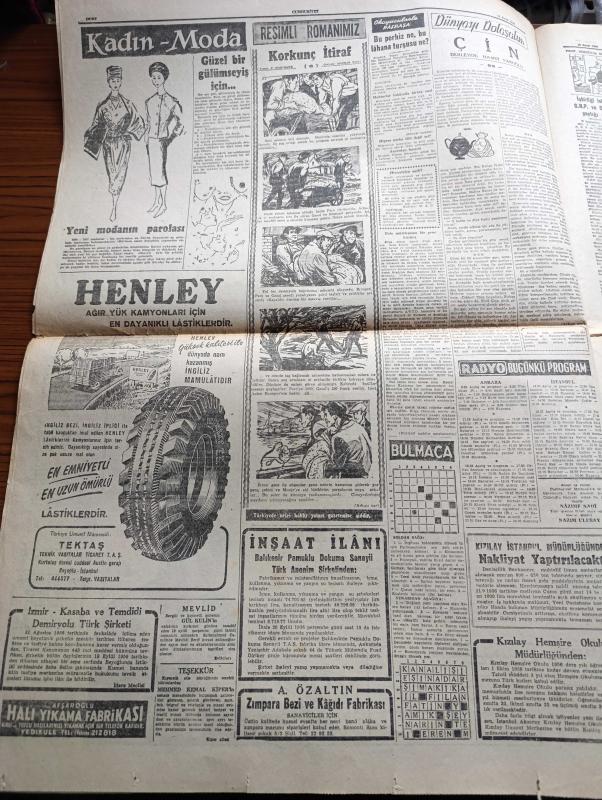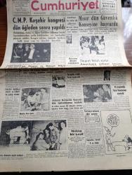 Cumhuriyet Gazetesi - 18 Eylül 1956 - Cumhuriyetçi Millet Partisi Kongresi Dün Öğleden Sonra Yapıldı - Mısır Dün Güvenlik Konseyine Başvurdu - Ticaret Vekili Zeyyad Mandalinci Acele Amerika'ya Gidiyor - 32 Ticaret Ve Sanayi Odası Reisi Ankara'da Toplanıyorlar - Türklüğe Hakaret Eden Şarkılar - Celal Tekiner'in Haksızlığa İsyan Adlı Şiir Kitabı Toplattırıldı - Don Camillo'nun Küçük Alemi Çeviren Burhan Felek Resimler Ali Ulvi Yazı Dizisi - Aşktan Da Üstün Yazan Elizabeth Gaskell Yazı Dizisi - Kıbrıs'a İngiliz İktisadi Yardımı - Kadın Moda Köşesi - Resimli Romanımız Korkunç İtiraf Çeviren Mazhar Kunt - Dünyayı Dolaşalım Çin Derleyen Hamdi Varoğlu Yazı Dizisi - Bulmaca - İstanbul Ankara Radyosu Programı - Profesyonel Boksörümüz Garbis Zaharyan Cumartesiye Dövüşüyor - Cim Bom Bom 50 Yaşında - Metin Oktay Yarın Oynamayacak - Fenerbahçe Club Sportif Yarın Oynayacaklar - İran'a Gidecek Olan Atletizm Takımı Belli Oldu - Hürriyetspor Federe Oldu adlı eser, Kitap > Süreli Yayınlar > Gazeteler > Türkiye > Genel > Günlük kategorisinde İkinci El olarak satıştadır.