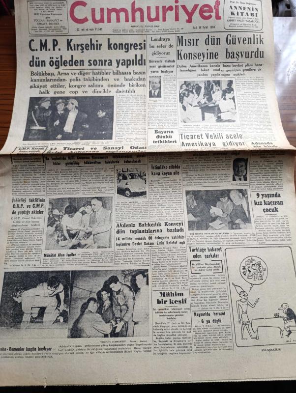Cumhuriyet Gazetesi - 18 Eylül 1956 - Cumhuriyetçi Millet Partisi Kongresi Dün Öğleden Sonra Yapıldı - Mısır Dün Güvenlik Konseyine Başvurdu - Ticaret Vekili Zeyyad Mandalinci Acele Amerika'ya Gidiyor - 32 Ticaret Ve Sanayi Odası Reisi Ankara'da Toplanıyorlar - Türklüğe Hakaret Eden Şarkılar - Celal Tekiner'in Haksızlığa İsyan Adlı Şiir Kitabı Toplattırıldı - Don Camillo'nun Küçük Alemi Çeviren Burhan Felek Resimler Ali Ulvi Yazı Dizisi - Aşktan Da Üstün Yazan Elizabeth Gaskell Yazı Dizisi - Kıbrıs'a İngiliz İktisadi Yardımı - Kadın Moda Köşesi - Resimli Romanımız Korkunç İtiraf Çeviren Mazhar Kunt - Dünyayı Dolaşalım Çin Derleyen Hamdi Varoğlu Yazı Dizisi - Bulmaca - İstanbul Ankara Radyosu Programı - Profesyonel Boksörümüz Garbis Zaharyan Cumartesiye Dövüşüyor - Cim Bom Bom 50 Yaşında - Metin Oktay Yarın Oynamayacak - Fenerbahçe Club Sportif Yarın Oynayacaklar - İran'a Gidecek Olan Atletizm Takımı Belli Oldu - Hürriyetspor Federe Oldu, Yunus Nadi tarafından kaleme alınmıştır. Cumhuriyet Gazetesi - 18 Eylül 1956 - Cumhuriyetçi Millet Partisi Kongresi Dün Öğleden Sonra Yapıldı - Mısır Dün Güvenlik Konseyine Başvurdu - Ticaret Vekili Zeyyad Mandalinci Acele Amerika'ya Gidiyor - 32 Ticaret Ve Sanayi Odası Reisi Ankara'da Toplanıyorlar - Türklüğe Hakaret Eden Şarkılar - Celal Tekiner'in Haksızlığa İsyan Adlı Şiir Kitabı Toplattırıldı - Don Camillo'nun Küçük Alemi Çeviren Burhan Felek Resimler Ali Ulvi Yazı Dizisi - Aşktan Da Üstün Yazan Elizabeth Gaskell Yazı Dizisi - Kıbrıs'a İngiliz İktisadi Yardımı - Kadın Moda Köşesi - Resimli Romanımız Korkunç İtiraf Çeviren Mazhar Kunt - Dünyayı Dolaşalım Çin Derleyen Hamdi Varoğlu Yazı Dizisi - Bulmaca - İstanbul Ankara Radyosu Programı - Profesyonel Boksörümüz Garbis Zaharyan Cumartesiye Dövüşüyor - Cim Bom Bom 50 Yaşında - Metin Oktay Yarın Oynamayacak - Fenerbahçe Club Sportif Yarın Oynayacaklar - İran'a Gidecek Olan Atletizm Takımı Belli Oldu - Hürriyetspor Federe Oldu adlı eser Türkçe dilindedir.