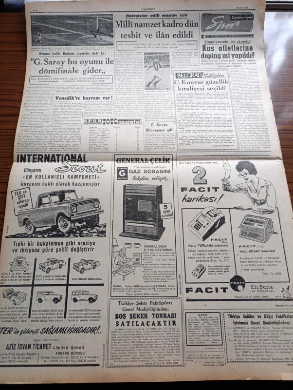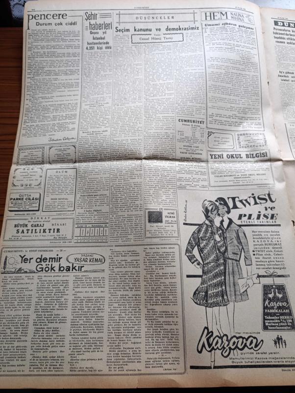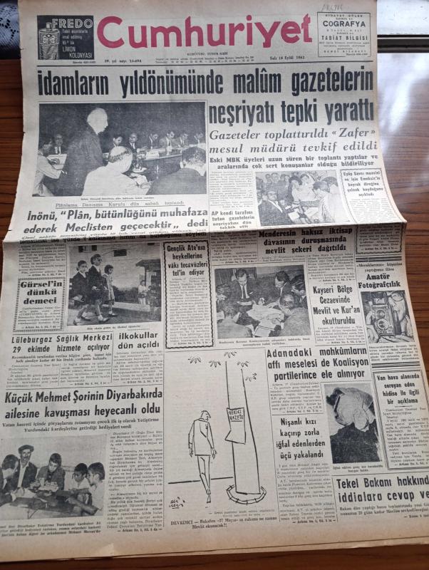 Cumhuriyet Gazetesi - 18 Eylül 1962 - İdamların Yıldönümünde Malum Gazetelerin Neşriyatı Tepki Yarattı - İsmet İnönü Danışma Kuruluna Plan Hakkında İzahat Verirken - Adnan Menderes'in Haksız İktisap Davasının Duruşmasında Mevlit Şekeri Dağıtıldı - Gençlik Atatürk'ün Heykellerine Tecavüzleri Tel'in Ediliyor - Lüleburgaz Sağlık Merkezi 29 Ekim'de Hizmete Açılıyor - Kayseri Bölge Cezaevinde Mevlit Ve Kur'an Okutturuldu - Yer Demir Gök Bakır Yazan Yaşar Kemal Yazı Dizisi - İlhan Selçuk Köşe Yazısı - Amerika'da Fidel Castro'ya Mutedil Davranılması Fikri Belirdi - İran Şahı Toprak Reformundan Geri Dönülemez Dedi - Burhan Felek Köşe Yazısı - Mutfak Sofra Yazan Raufi Manyas - Profesör Nümbüs'ün Maceraları Çizgi Roman - Jane'in Kızı Çizgi Roman - Resimli Roman Melun Kız Çizen Yves Sayol - Canel Konvur Güzellik Kraliçesi Seçildi - Dinamo Kafile Başkanı Galatasaray Bu Oyunu İle Dömifinale Gider - Dedi - Avrupa Atletizm Şampiyonası - Rus Atletlerine Doping Mi Yapıldı - Fikret Kırcan Almanya'da, Yunus Nadi tarafından kaleme alınmıştır. Cumhuriyet Gazetesi - 18 Eylül 1962 - İdamların Yıldönümünde Malum Gazetelerin Neşriyatı Tepki Yarattı - İsmet İnönü Danışma Kuruluna Plan Hakkında İzahat Verirken - Adnan Menderes'in Haksız İktisap Davasının Duruşmasında Mevlit Şekeri Dağıtıldı - Gençlik Atatürk'ün Heykellerine Tecavüzleri Tel'in Ediliyor - Lüleburgaz Sağlık Merkezi 29 Ekim'de Hizmete Açılıyor - Kayseri Bölge Cezaevinde Mevlit Ve Kur'an Okutturuldu - Yer Demir Gök Bakır Yazan Yaşar Kemal Yazı Dizisi - İlhan Selçuk Köşe Yazısı - Amerika'da Fidel Castro'ya Mutedil Davranılması Fikri Belirdi - İran Şahı Toprak Reformundan Geri Dönülemez Dedi - Burhan Felek Köşe Yazısı - Mutfak Sofra Yazan Raufi Manyas - Profesör Nümbüs'ün Maceraları Çizgi Roman - Jane'in Kızı Çizgi Roman - Resimli Roman Melun Kız Çizen Yves Sayol - Canel Konvur Güzellik Kraliçesi Seçildi - Dinamo Kafile Başkanı Galatasaray Bu Oyunu İle Dömifinale Gider - Dedi - Avrupa Atletizm Şampiyonası - Rus Atletlerine Doping Mi Yapıldı - Fikret Kırcan Almanya'da adlı eser Türkçe dilindedir.