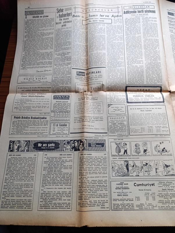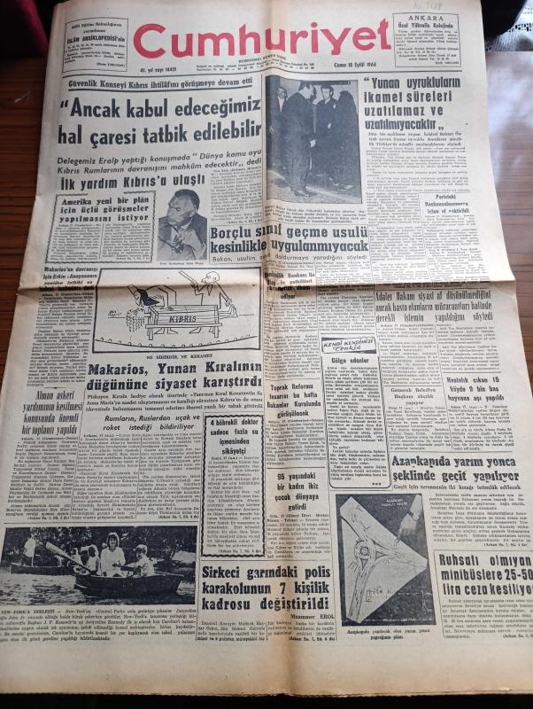Cumhuriyet Gazetesi - 18 Eylül 1964 - Güvenlik Konseyi Kıbrıs İhtilafını Görüşmeye Devam Etti - İçişleri Bakanı Orhan Öztrak Yunan Uyrukluların İkamet Süresi Uzatılamaz Ve Uzatılmayacaktır Dedi - Makarios Yunan Kralının Düğününe Siyaset Karıştırdı - Toprak Reformu Tasarısı Bu Hafta Bakanlar Kurulunda Görüşülecek - Azapkapı'da Yarım Yonca Şeklinde Geçit Yapılıyor - Adalet Bakanı Sedat Çumralı Siyasi Af Yok Ama Hasta Mahkumlar Bırakılabilir - Gözlük Ve Çizme Yazan İlhan Selçuk Köşe Yazısı - Bir Acı Şarkı Yazan Cronin Yazı Dizisi - Fidel Castro Batırılan İspanyol Gemisinin Sorumluluğunu Amerika'ya Yüklüyor - Bay Oscar Karikatür - Profesör Nimbüs'ün Maceraları Çizgi Roman - Perde Aralığından Yazan Nadir Nadi Yazı Dizisi - Balkan Melodileri Festivali - Türk Solisti Tülay German Fotoğraf- Hollanda'daki Maçtan Sonra Fenerbahçeliler Tartaklandı - Fenerbahçe Kulüp Başkanı İsmet Uluğ Maç Tekrarlanacak Dedi - Galatasaray Aufbau'yu Kupadan Silemedi 1 1 - Avrupa Şampiyon Kulüpler Kupa Galipleri, Yunus Nadi tarafından kaleme alınmıştır. Cumhuriyet Gazetesi - 18 Eylül 1964 - Güvenlik Konseyi Kıbrıs İhtilafını Görüşmeye Devam Etti - İçişleri Bakanı Orhan Öztrak Yunan Uyrukluların İkamet Süresi Uzatılamaz Ve Uzatılmayacaktır Dedi - Makarios Yunan Kralının Düğününe Siyaset Karıştırdı - Toprak Reformu Tasarısı Bu Hafta Bakanlar Kurulunda Görüşülecek - Azapkapı'da Yarım Yonca Şeklinde Geçit Yapılıyor - Adalet Bakanı Sedat Çumralı Siyasi Af Yok Ama Hasta Mahkumlar Bırakılabilir - Gözlük Ve Çizme Yazan İlhan Selçuk Köşe Yazısı - Bir Acı Şarkı Yazan Cronin Yazı Dizisi - Fidel Castro Batırılan İspanyol Gemisinin Sorumluluğunu Amerika'ya Yüklüyor - Bay Oscar Karikatür - Profesör Nimbüs'ün Maceraları Çizgi Roman - Perde Aralığından Yazan Nadir Nadi Yazı Dizisi - Balkan Melodileri Festivali - Türk Solisti Tülay German Fotoğraf- Hollanda'daki Maçtan Sonra Fenerbahçeliler Tartaklandı - Fenerbahçe Kulüp Başkanı İsmet Uluğ Maç Tekrarlanacak Dedi - Galatasaray Aufbau'yu Kupadan Silemedi 1 1 - Avrupa Şampiyon Kulüpler Kupa Galipleri adlı eser Türkçe dilindedir.