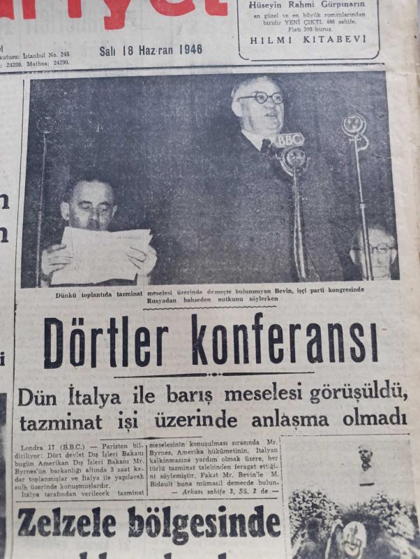 Cumhuriyet Gazetesi - 18 Haziran 1946 - Demokrat Parti'nin Seçimlere İştirak Kararı Yazanlar Abidin Daver Köşe - Partilerde Seçim Faaliyeti Hızlandı - Milli Kalkınma Partisinin Kararı - Halk Partisi Adına Yapılan Bir Açıklama - Falih Rıfkı Atay - Şinasinin Büstü Dün Açıldı - Kılıç Ali Halk Partisinden İstifa Etti - Ankara Cinayeti - Varto Deprem Bölgesinde Acıklı Sahneler - İçtimai Bahisler Yazan Şükrü Kaya - Türk Tipi Amerikan Tütünü - Ekmek Bugünden İtibaren 27 Kuruşa Satılacak - Galatasaray Kulübünün Denizcilik Şubesi Açıldı - İstanbul'da İlk Defa Gangsterler Şirketi Alkazar Sinemasında - Amcabey Ve Toprak Bayramı Çizen Cemal Nadir - Von Papen'in Muhakemesi - Güven Sigorta - Elazığ Van Demiryolu - Bugünkü Radyo Programı - Bulmaca - Borsa, Yunus Nadi tarafından kaleme alınmıştır. Cumhuriyet Gazetesi - 18 Haziran 1946 - Demokrat Parti'nin Seçimlere İştirak Kararı Yazanlar Abidin Daver Köşe - Partilerde Seçim Faaliyeti Hızlandı - Milli Kalkınma Partisinin Kararı - Halk Partisi Adına Yapılan Bir Açıklama - Falih Rıfkı Atay - Şinasinin Büstü Dün Açıldı - Kılıç Ali Halk Partisinden İstifa Etti - Ankara Cinayeti - Varto Deprem Bölgesinde Acıklı Sahneler - İçtimai Bahisler Yazan Şükrü Kaya - Türk Tipi Amerikan Tütünü - Ekmek Bugünden İtibaren 27 Kuruşa Satılacak - Galatasaray Kulübünün Denizcilik Şubesi Açıldı - İstanbul'da İlk Defa Gangsterler Şirketi Alkazar Sinemasında - Amcabey Ve Toprak Bayramı Çizen Cemal Nadir - Von Papen'in Muhakemesi - Güven Sigorta - Elazığ Van Demiryolu - Bugünkü Radyo Programı - Bulmaca - Borsa adlı eser Türkçe dilindedir.