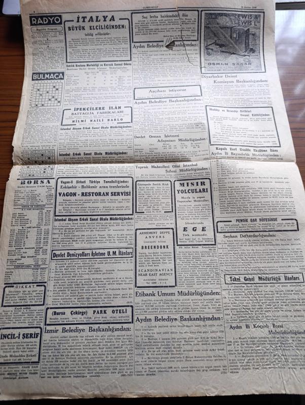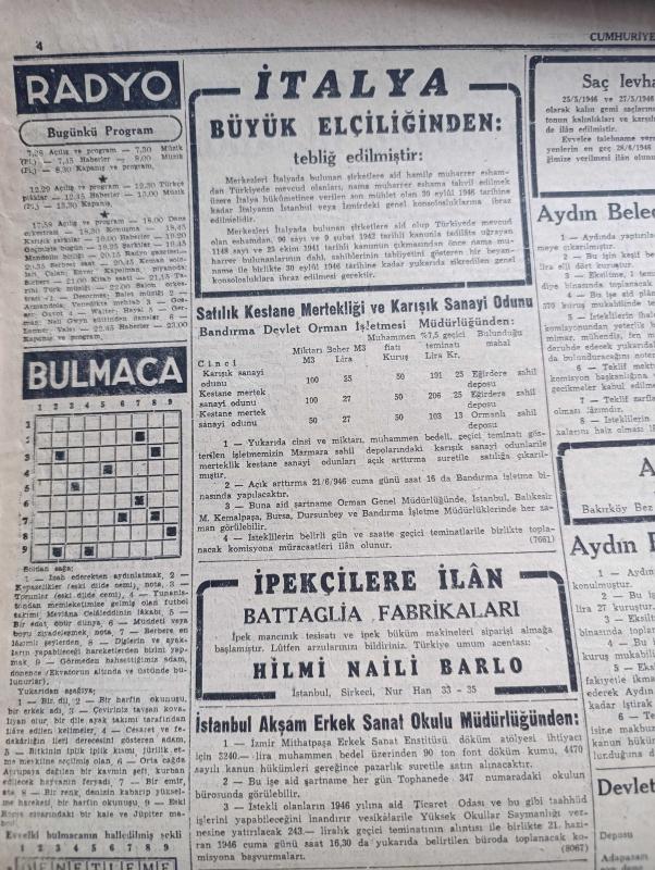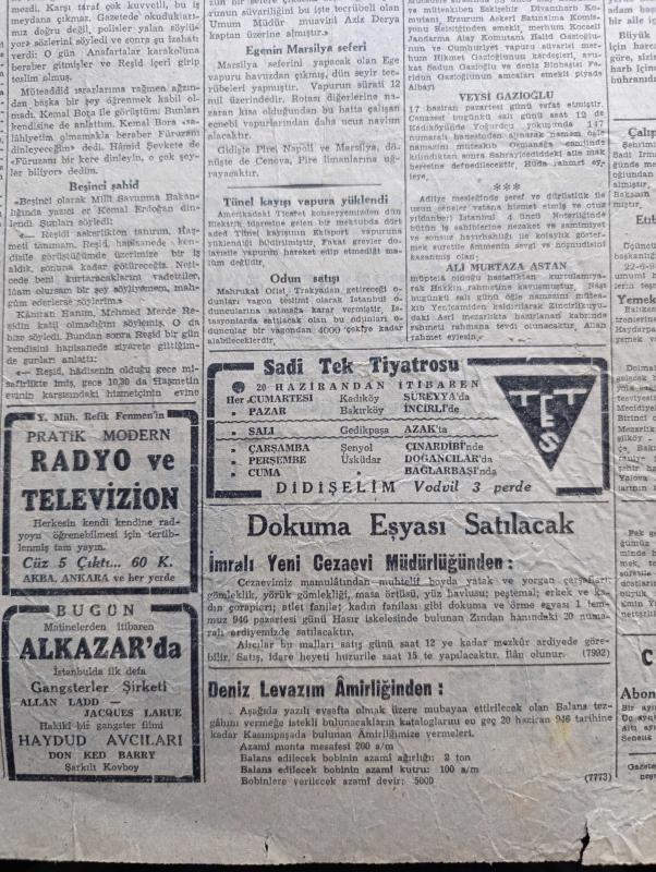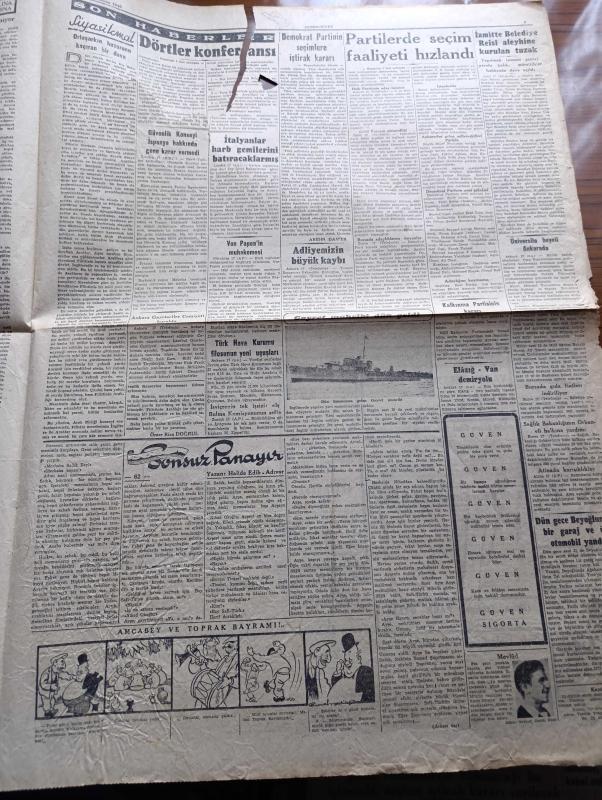 Cumhuriyet Gazetesi - 18 Haziran 1946 - Demokrat Parti'nin Seçimlere İştirak Kararı Yazanlar Abidin Daver Köşe - Partilerde Seçim Faaliyeti Hızlandı - Milli Kalkınma Partisinin Kararı - Halk Partisi Adına Yapılan Bir Açıklama - Falih Rıfkı Atay - Şinasinin Büstü Dün Açıldı - Kılıç Ali Halk Partisinden İstifa Etti - Ankara Cinayeti - Varto Deprem Bölgesinde Acıklı Sahneler - İçtimai Bahisler Yazan Şükrü Kaya - Türk Tipi Amerikan Tütünü - Ekmek Bugünden İtibaren 27 Kuruşa Satılacak - Galatasaray Kulübünün Denizcilik Şubesi Açıldı - İstanbul'da İlk Defa Gangsterler Şirketi Alkazar Sinemasında - Amcabey Ve Toprak Bayramı Çizen Cemal Nadir - Von Papen'in Muhakemesi - Güven Sigorta - Elazığ Van Demiryolu - Bugünkü Radyo Programı - Bulmaca - Borsa adlı eser, Kitap > Süreli Yayınlar > Gazeteler > Türkiye > Genel > Günlük kategorisinde İkinci El olarak satıştadır.