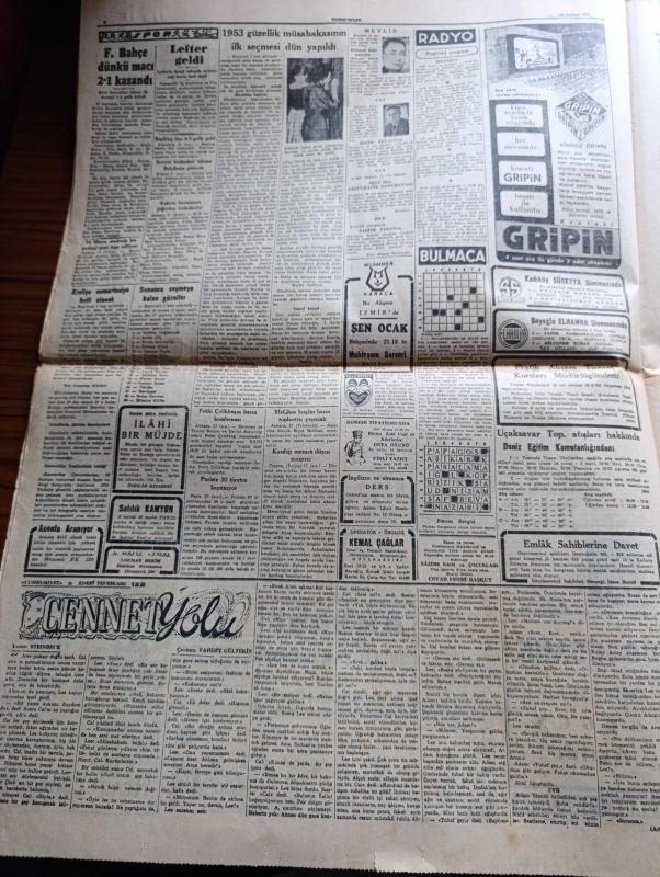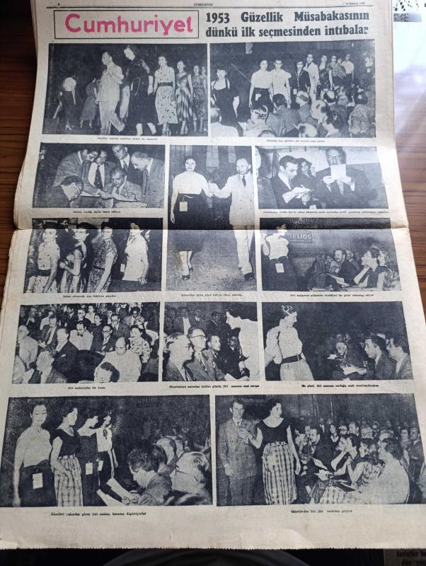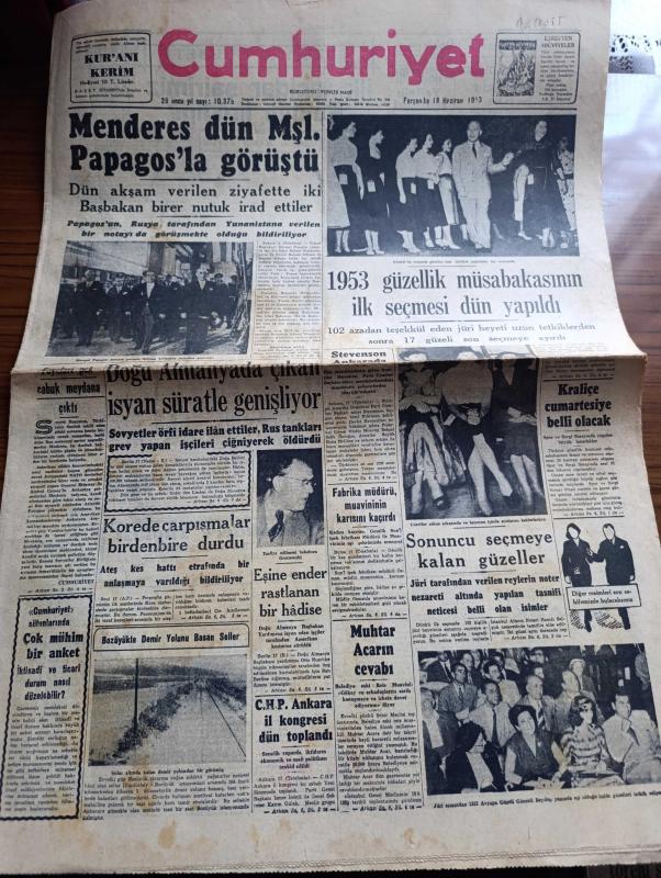 Cumhuriyet Gazetesi - 18 Haziran 1953 - Adnan Menderes dün Mareşal Papagos ile görüştü fotoğraf - 1953 güzellik müsabakasının ilk seçmesi dün yapıldı - güzeller sahne arkasında ve heyecan içinde sıralarını beklerlerken fotoğraf - Jüri azasından 1952 Avrupa güzeli Günseli Beydeş yanında eşi olduğu halde güzelleri tetkik ediyor fotoğraf - Doğu Almanya'da çıkan isyan süratle genişliyor - Kore'de çarpışmalar birdenbire durdu - Doğu Almanya başbakan yardımcısı Grottewohl isyan eden işçiler tarafından Amerikan kesimine sürüldü - Beyazıt hamamı yıkılmamalıdır yazan Emin Ali Çavli - Galatasaray Kulübü umumi kaptanı Kadir Dağ aleyhine açılan dava - Rami göçmen Mahallesi'nde sağlık kontrolleri - Cennet Yolu yazan Steinbeck Yazı Dizisi - Lefter Küçükandonyadis'in hangi takımda oynayacağı belli değil - Beşiktaş Danimarka takımı Fionie'yi Yendi - Piç Kurusu Yazan Azmiye Hami Güven Yazı Dizisi - 1953 güzellik müsabakasının dünkü ilk seçmesinden intibalar fotoğraflar - Gülyüz Okçu Sahnede Fotoğrafı, Yunus Nadi tarafından kaleme alınmıştır. Cumhuriyet Gazetesi - 18 Haziran 1953 - Adnan Menderes dün Mareşal Papagos ile görüştü fotoğraf - 1953 güzellik müsabakasının ilk seçmesi dün yapıldı - güzeller sahne arkasında ve heyecan içinde sıralarını beklerlerken fotoğraf - Jüri azasından 1952 Avrupa güzeli Günseli Beydeş yanında eşi olduğu halde güzelleri tetkik ediyor fotoğraf - Doğu Almanya'da çıkan isyan süratle genişliyor - Kore'de çarpışmalar birdenbire durdu - Doğu Almanya başbakan yardımcısı Grottewohl isyan eden işçiler tarafından Amerikan kesimine sürüldü - Beyazıt hamamı yıkılmamalıdır yazan Emin Ali Çavli - Galatasaray Kulübü umumi kaptanı Kadir Dağ aleyhine açılan dava - Rami göçmen Mahallesi'nde sağlık kontrolleri - Cennet Yolu yazan Steinbeck Yazı Dizisi - Lefter Küçükandonyadis'in hangi takımda oynayacağı belli değil - Beşiktaş Danimarka takımı Fionie'yi Yendi - Piç Kurusu Yazan Azmiye Hami Güven Yazı Dizisi - 1953 güzellik müsabakasının dünkü ilk seçmesinden intibalar fotoğraflar - Gülyüz Okçu Sahnede Fotoğrafı adlı eser Türkçe dilindedir.