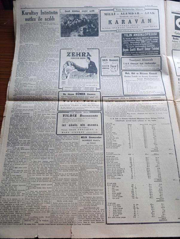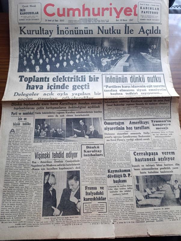 Cumhuriyet Gazetesi - 18 Kasım 1947 - Parti Ve Memleket İçin En Büyük Tehlike Yazan Nadir Nadi Köşe Yazısı - Cumhuriyet Halk Partisi Kurultayı İsmet İnönü'nün Nutku İle Açıldı Fotoğraf - İsmet İnönü'nün Nutku - Toplantı Elektrikli Bir Hava İçinde Geçti - Türkiye Genelkurmay Başkanı General Salih Omurtağın Amerika'ya Ziyaretin Hoş Tarafları - Cerrahpaşa Verem Hastanesi Açılıyor - Cumhuriyet Halk Partisi Kurultayında Şükrü Saracoğlu ve Müşahid Olarak Çağrılan Demokrat Parti Temsilcileri - Kaymakam Hüsnü Gider Tarafından Dövülen Demokrat Parti'li Ali Şahinşah - Kısa Bir Dolaşmanın Notları Yazan Nadir Nadi Yazı Dizisi - Şeref Stadyumu Depo Oluyor - Rüya Gibi Nakleden Hamdi Varoğlu Yazı Dizisi - Birmanyanın İstiklali Ömer Rıza Doğrul Köşe Yazısı - Isparta'da Yeni Bir Seçim Davası - Çocuk Kitapları Sergisi Açıldı - Zehra Herkesin Kadını Şark Sinemasında - Yeni Ses Opereti Geçim Dünyası - Perihan Altındağ Mustafa Kovancı Ve Semiha Altın Kadıköy Opera Sinemasında - Canlı Domuz Satışı adlı eser, Kitap > Süreli Yayınlar > Gazeteler > Türkiye > Genel > Günlük kategorisinde İkinci El olarak satıştadır.