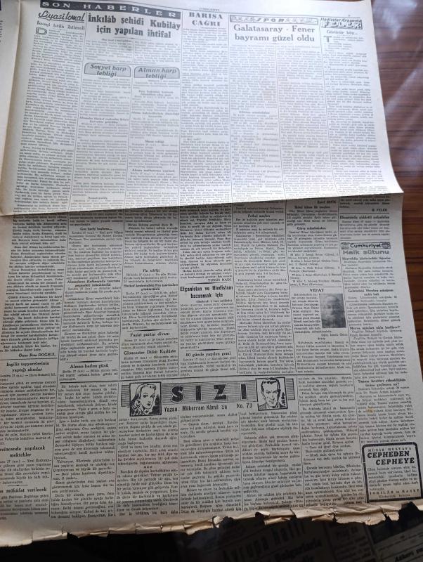 Sayfa Boyutu : 42*58 cm Sayfa Sayısı: 4 Cumhuriyet Gazetesi Yıpranma, sararmalar, kupon kesiği ve yırtılmalar zamana bağlı olarak görülebilir Bilgilendirme : Tam takım gazetedir