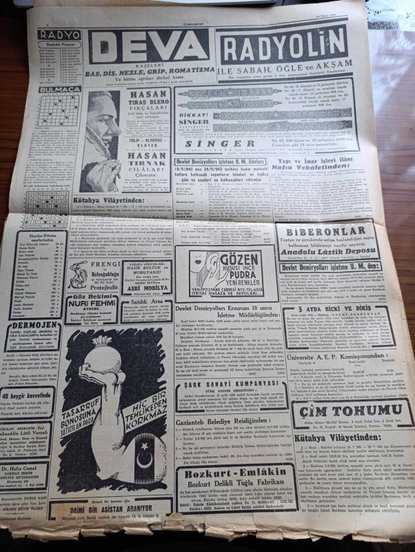 Cumhuriyet Gazetesi - 18 Mayıs 1942 - Barışa Çağrı Yazan Yunus Nadi Başmakale - İnkılap Şehidi Kubilay İçin Yapılan İhtifal - Menemendeki Kubilay Abidesi Fotoğraf - Gandi'nin Dahiyane Bir Buluşu - Atatürk'ün Samsun'a Ayak Bastığı Gün - Afganistan Ve Hindistan'ı Kazanmak İçin Mihver Devletler Kabilelere Altın Dağıtıyormuş - Galatasaray Fenerbahçe Bayramı Güzel Oldu Fotoğraf - Birmanya Hint Hududunda İngiliz Ordusu - Alman Harp Tebliği Harkof Taarruzu Akim Kaldi - Sovyet Ordusunun Bugünkü Durumu Yazan Emekli General H. Emir - Sovyet Harp Tebliği Kerç Şehri Bölgesinde Kuvvetlerimiz İnat İle Çarpışmaktadır - Tehlikeli Mehtap Filmi Yarın Akşam Sümer Sinemasında - Büyük Türk Hürriyetperveri Ali Suavi'nin Yıldönümü - Romanlarımız Bir Sürgün Yazan İsmail Habib - Nafia Vekili Ali Fuat Cebesoy Ankara'ya Gitti - İsveçi İstila İhtimali Yazan Ömer Rıza Doğrul - Görünür Köy Yazan Burhan Felek Köşe Yazısı - Faşist Partisi Divanı - Bugünkü Radyo Programı - Deva Ağrı Kesici - Radyolin Diş Macunu adlı eser, Kitap > Süreli Yayınlar > Gazeteler > Türkiye > Genel > Günlük kategorisinde İkinci El olarak satıştadır.
